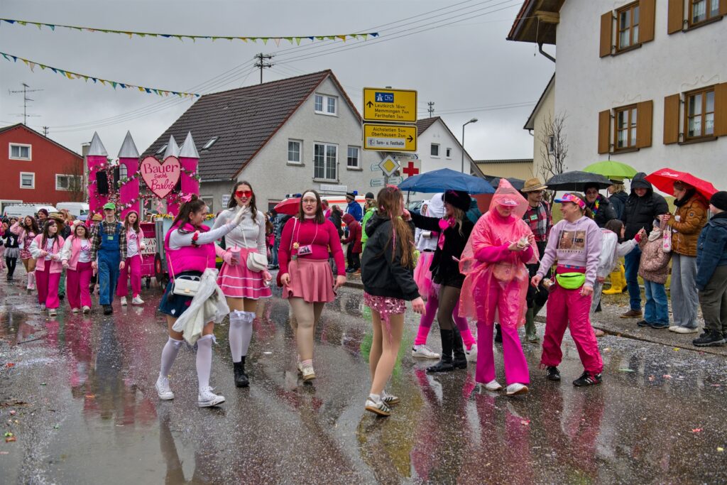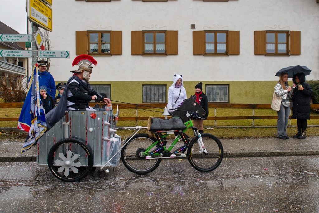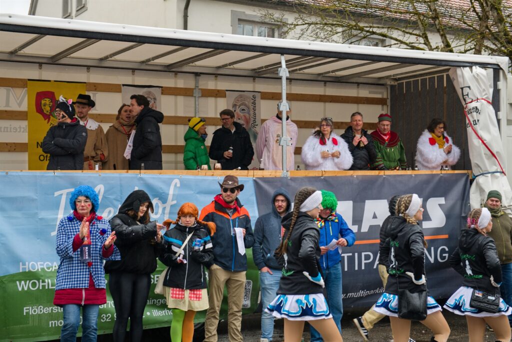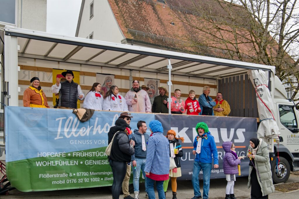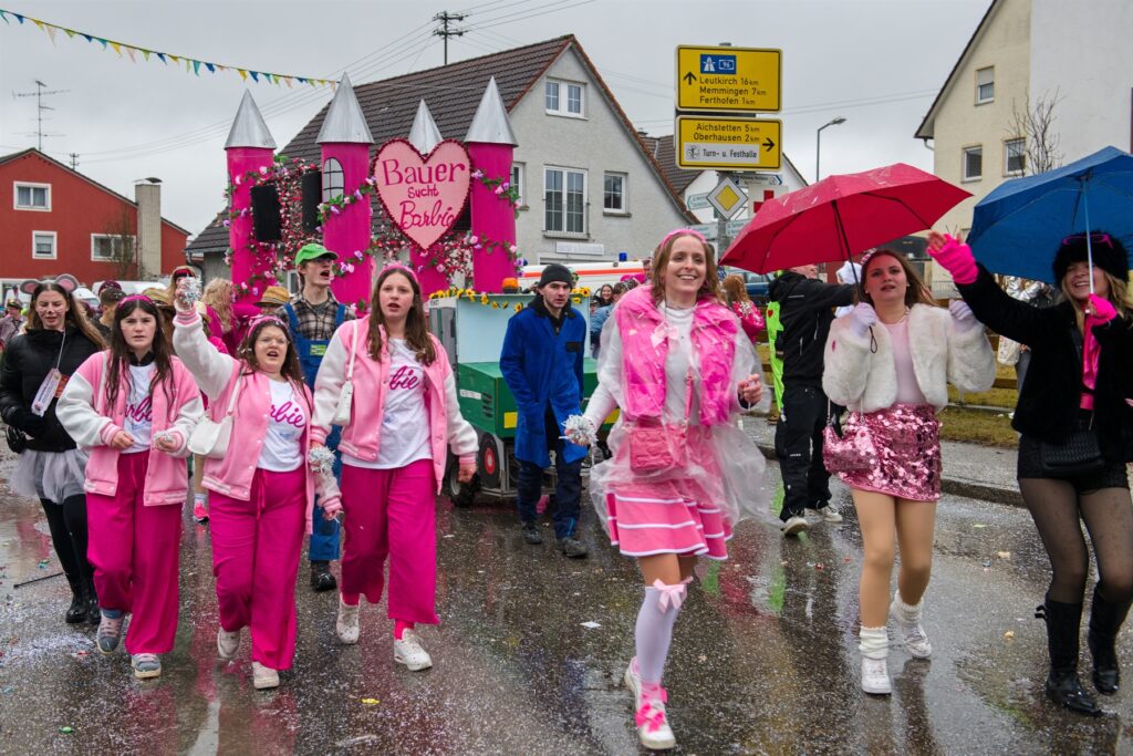 Aber auch die Bayern waren stark vertreten: Faschingswagen, Fuß-, Musik- und Maskengruppen aus Memmingen und Ronsberg, sowie Illerbeuren, Volkratshofen, Legau und Memmingerberg bereicherten den närrischen Gaudiwurm. Die Landjugend Volkeratshofen hatte einen Barbie-Wagen mit dem aktuellen Thema „Bauer sucht Barbie“.
