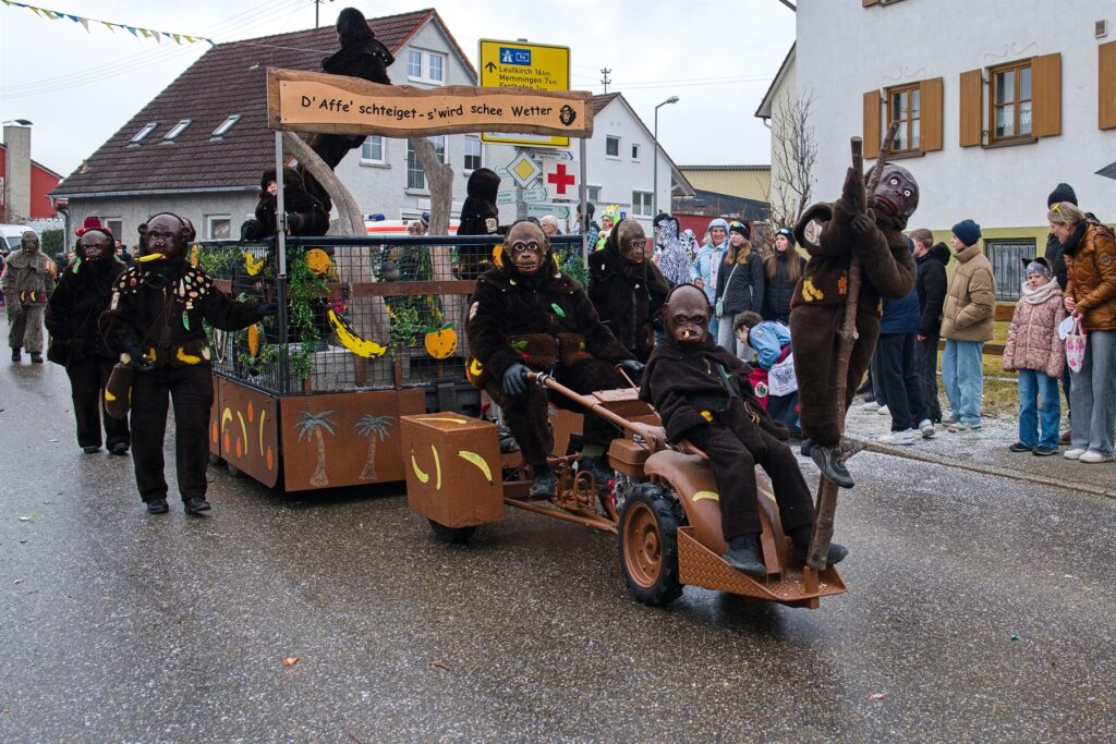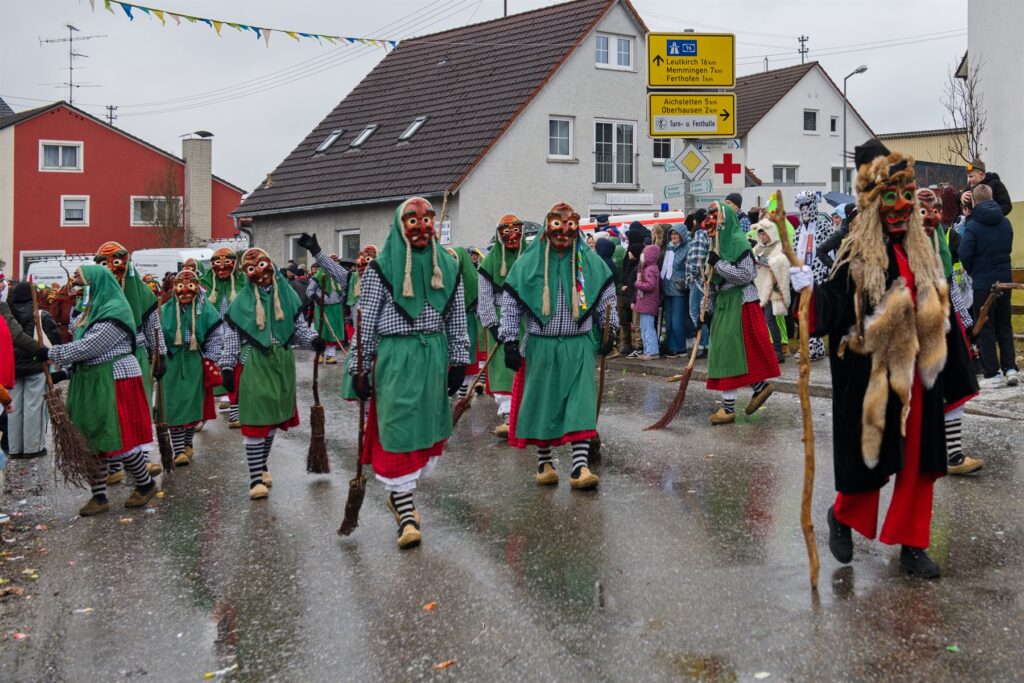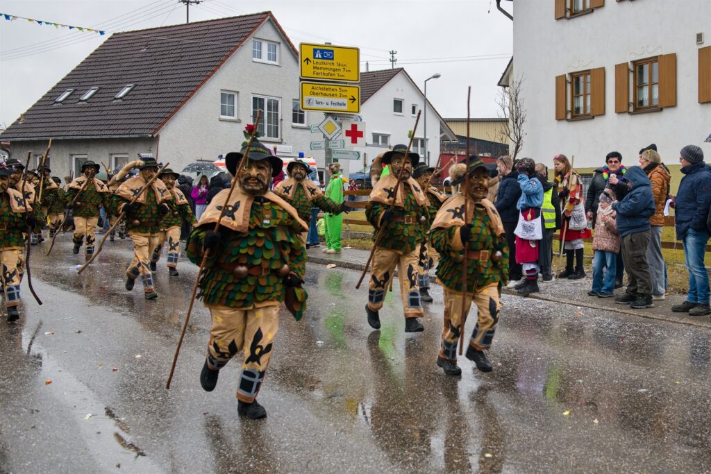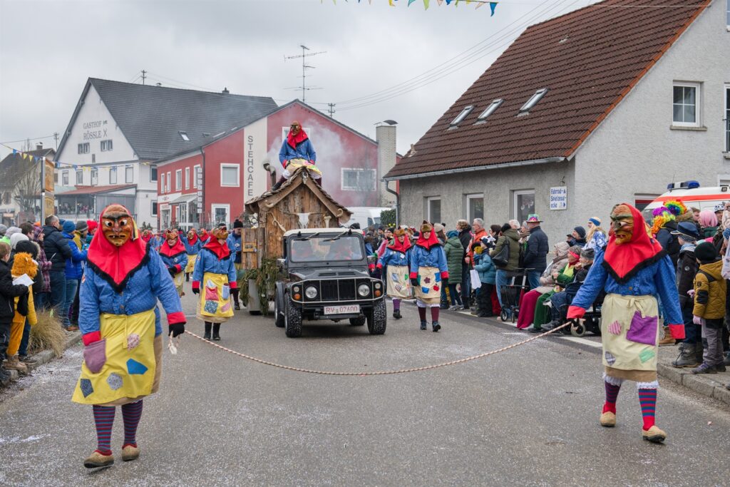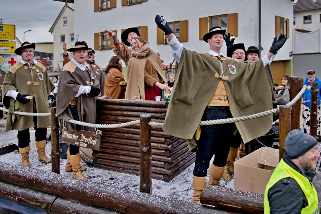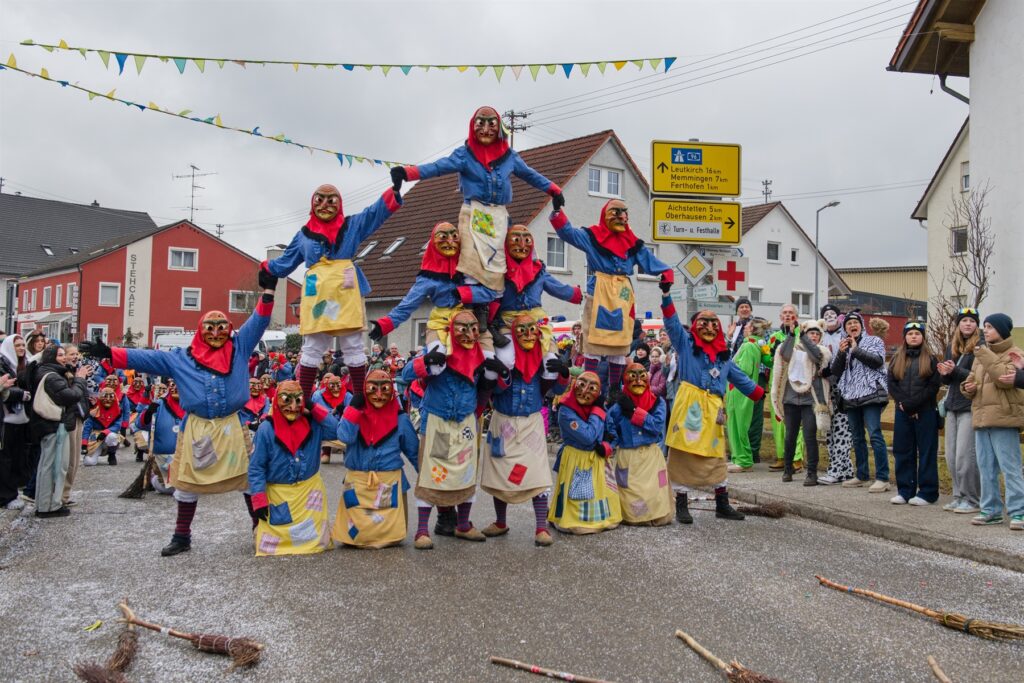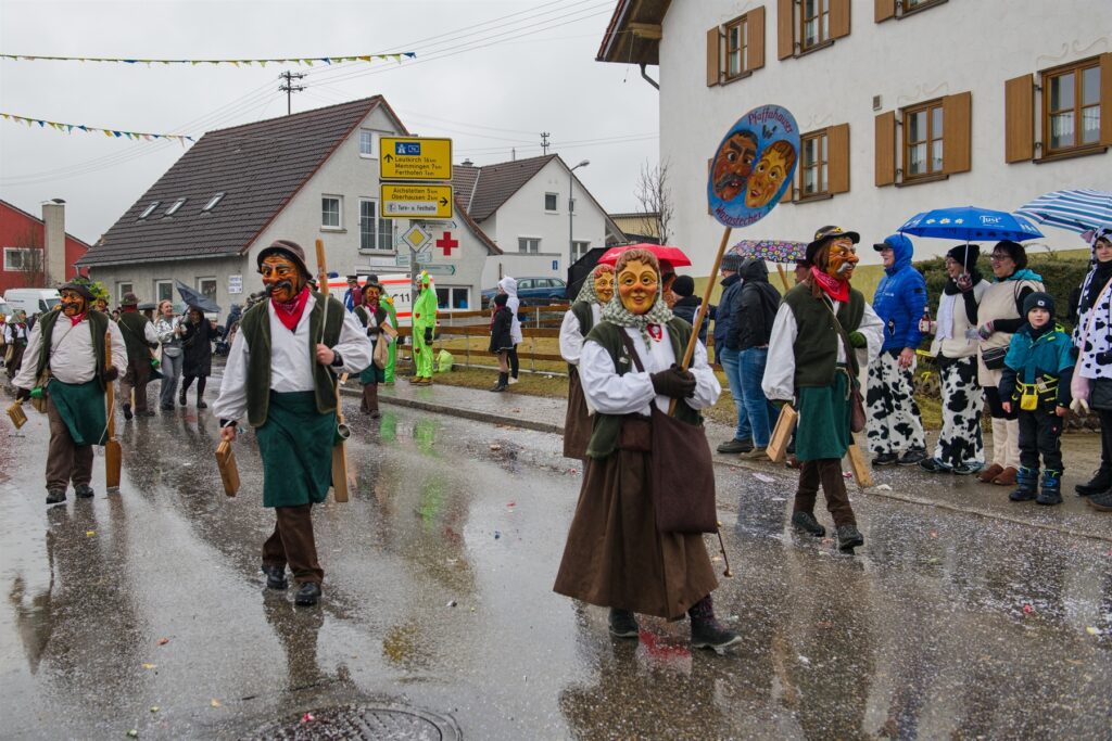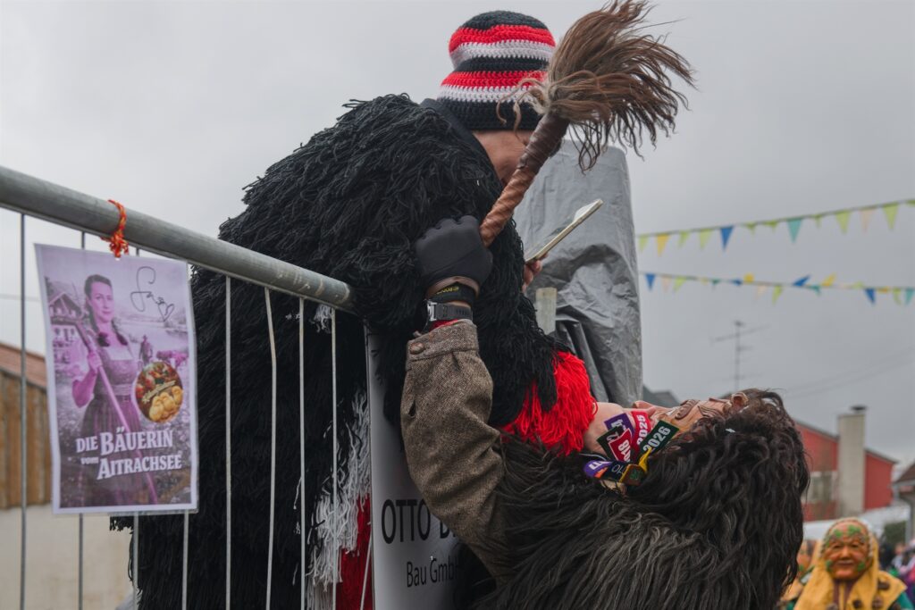 Aitrach – Getreu dem diesjährigen Motto der Aitracher Fasnet „Auf dem Bauernhof“ präsentierten sich am Samstag viele Fußgruppen der heimischen Narrenzunft beim traditionellen Narrensprung in der Illertalgemeinde. Mehr als 3000 Mitwirkende in 75 Gruppen sorgten für Hochstimmung beim zweistündigen Umzug. Hästräger von 35 Narrenzünften der alemannischen Fasnet, dem bayerischen Fasching, Prinzenpaare und Gardemädchen, Lumpenkapellen, Fanfarenzüge, Schalmeien und Blaskapellen begeisterten die zahlreichen Besucher.