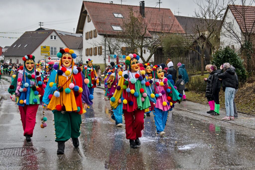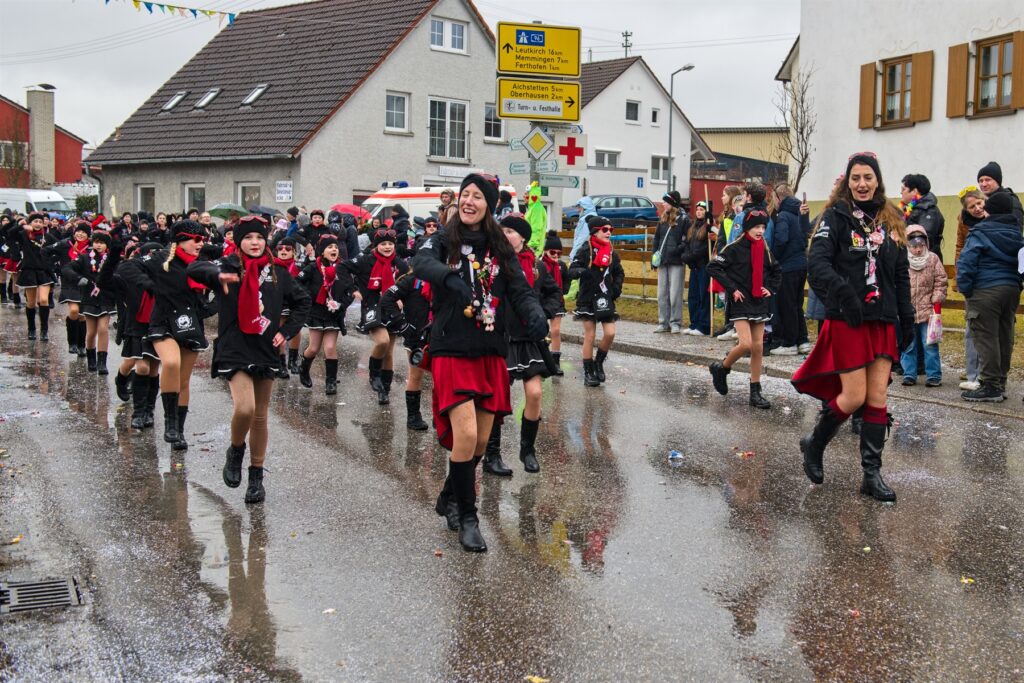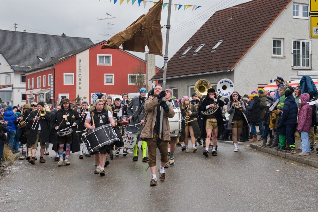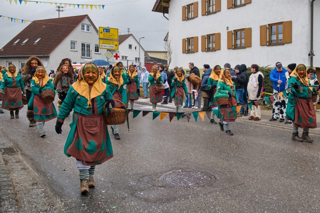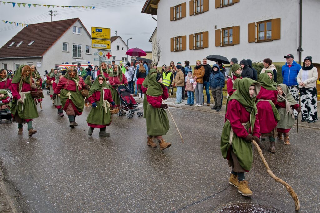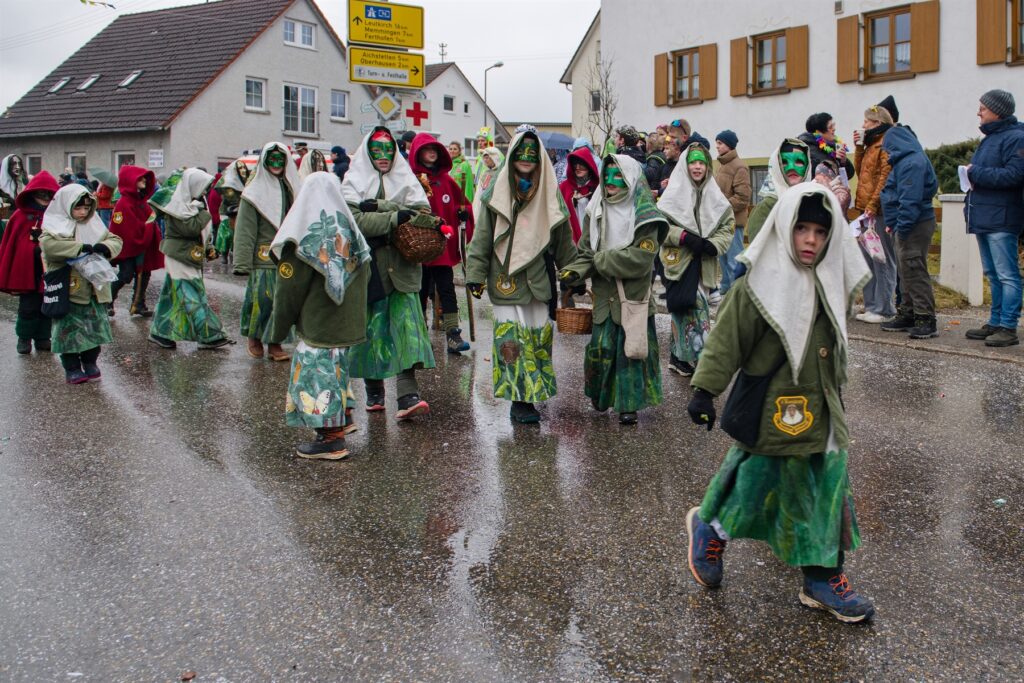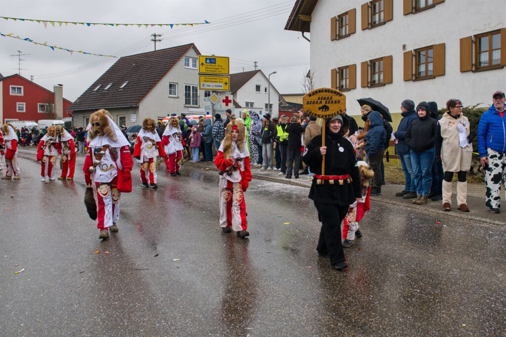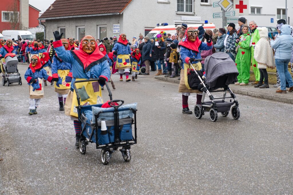 Aitrach – Getreu dem diesjährigen Motto der Aitracher Fasnet „Auf dem Bauernhof“ präsentierten sich am Samstag viele Fußgruppen der heimischen Narrenzunft beim traditionellen Narrensprung in der Illertalgemeinde. Mehr als 3000 Mitwirkende in 75 Gruppen sorgten für Hochstimmung beim zweistündigen Umzug. Hästräger von 35 Narrenzünften der alemannischen Fasnet, dem bayerischen Fasching, Prinzenpaare und Gardemädchen, Lumpenkapellen, Fanfarenzüge, Schalmeien und Blaskapellen begeisterten die zahlreichen Besucher.