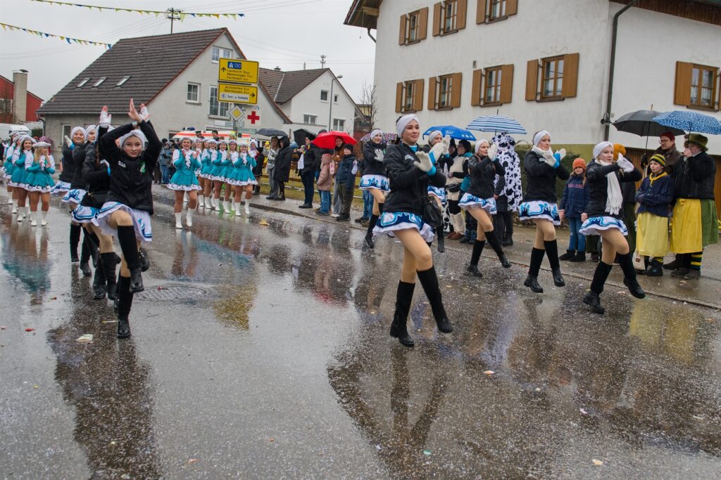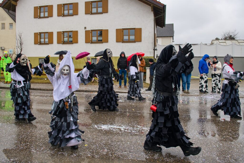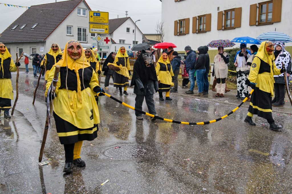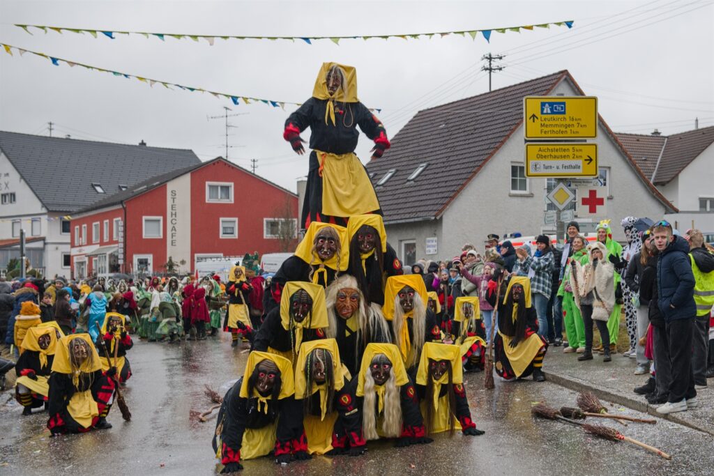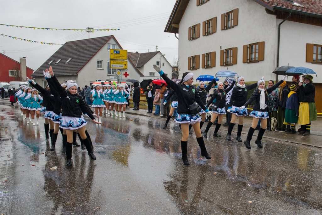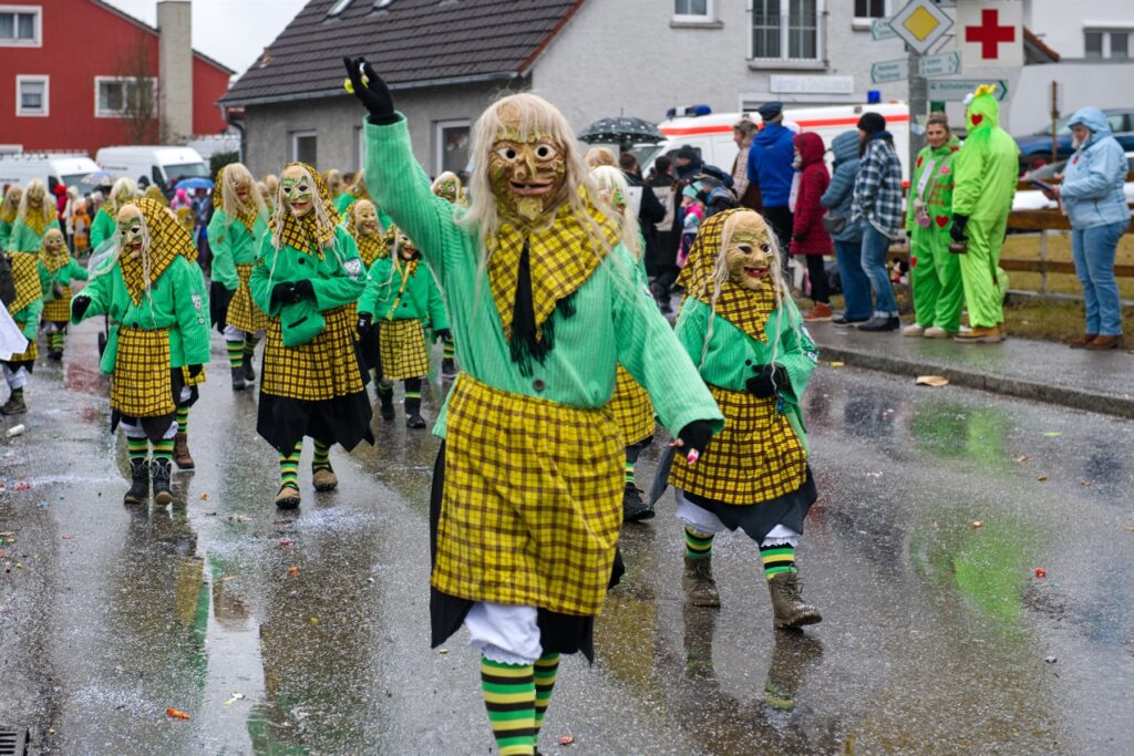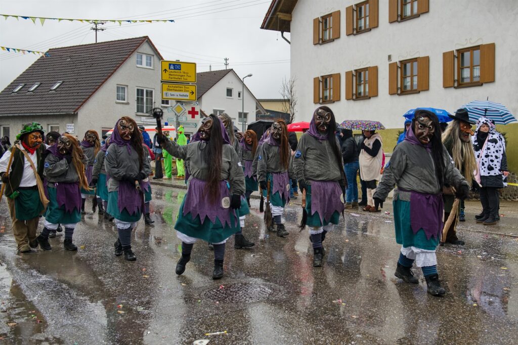 Ein großes Kompliment gilt allen Maskenträgern und Gruppen für das disziplinierte Verhalten während des Umzuges bei solchen Witterungsverhältnissen – das gilt besonders für die Gardemädchen, die trotz leichter Bekleidung ihre Tänze zeigten, aber auch für die Hexen, die trotz Nässe und Kälte ihre Pyramiden bauten.
