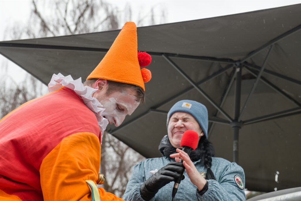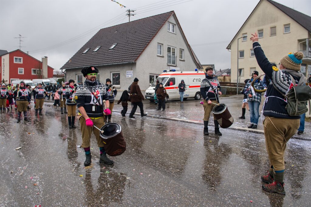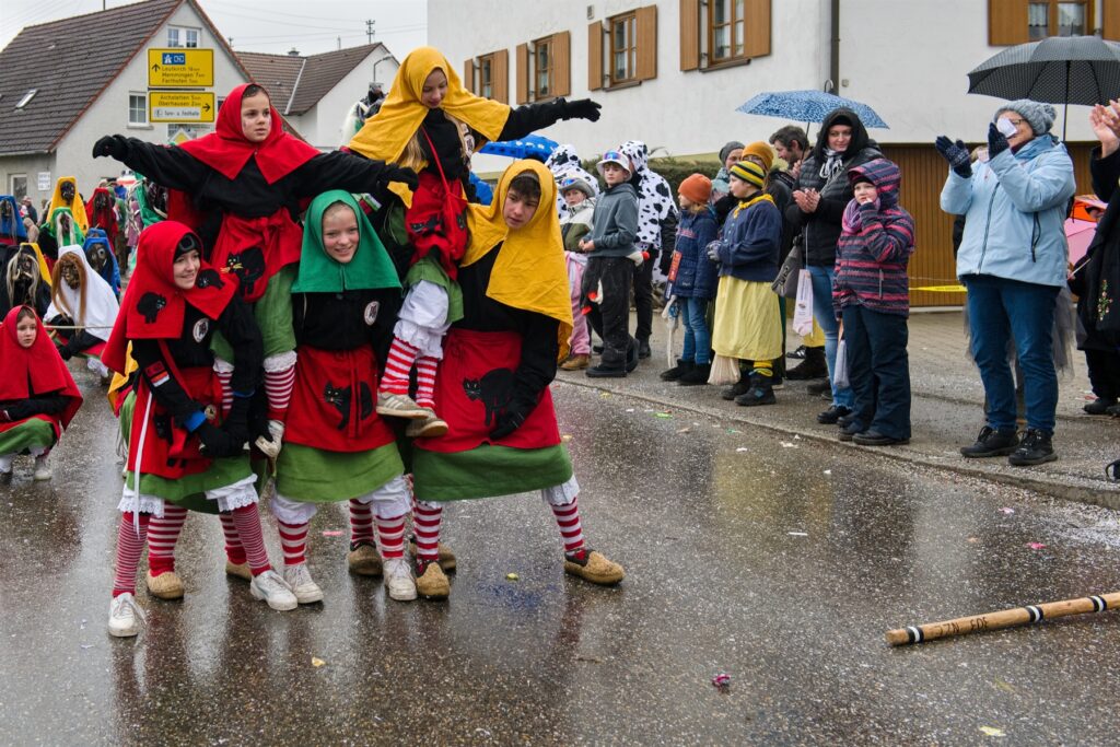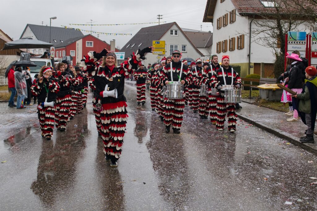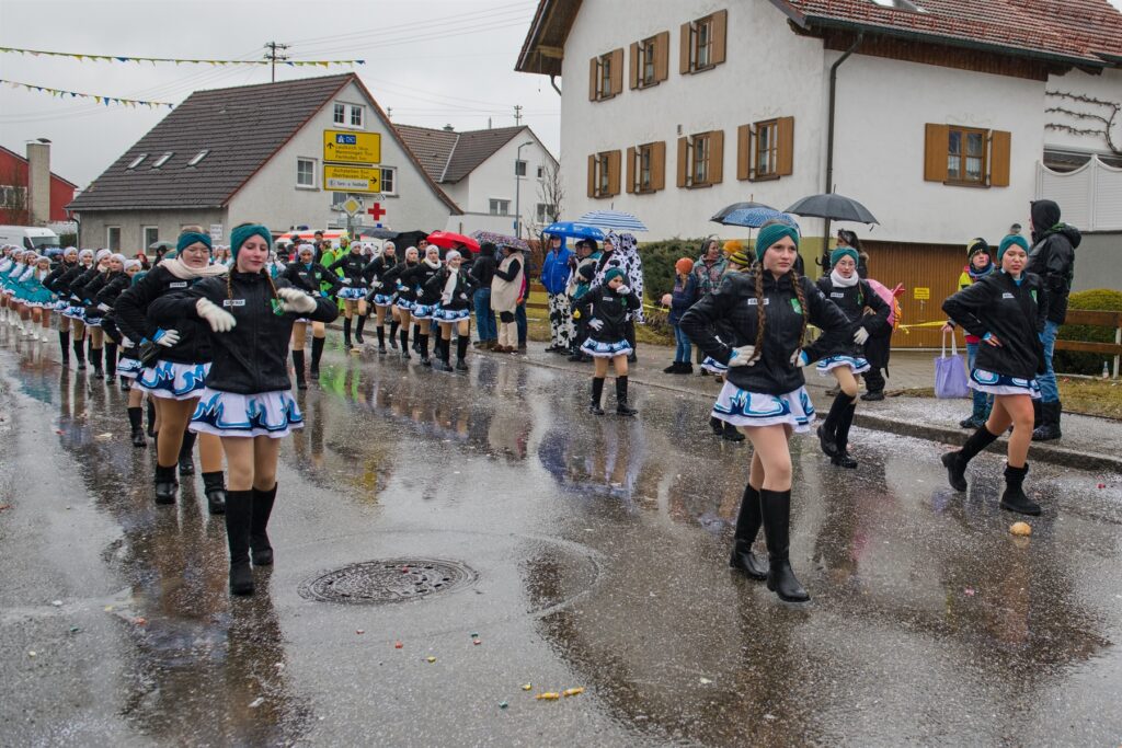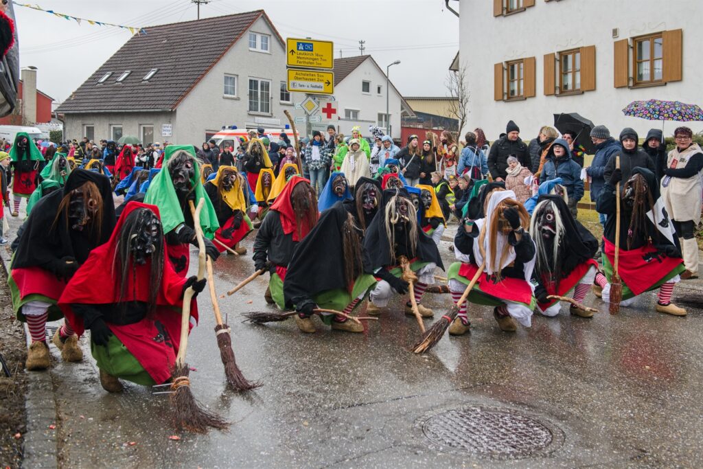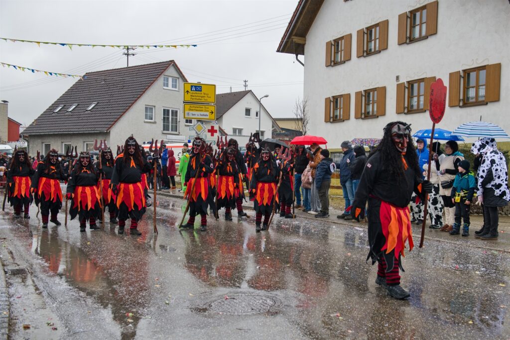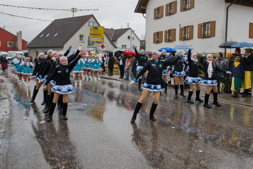 Ein großes Kompliment gilt allen Maskenträgern und Gruppen für das disziplinierte Verhalten während des Umzuges bei solchen Witterungsverhältnissen – das gilt besonders für die Gardemädchen, die trotz leichter Bekleidung ihre Tänze zeigten, aber auch für die Hexen, die trotz Nässe und Kälte ihre Pyramiden bauten.
