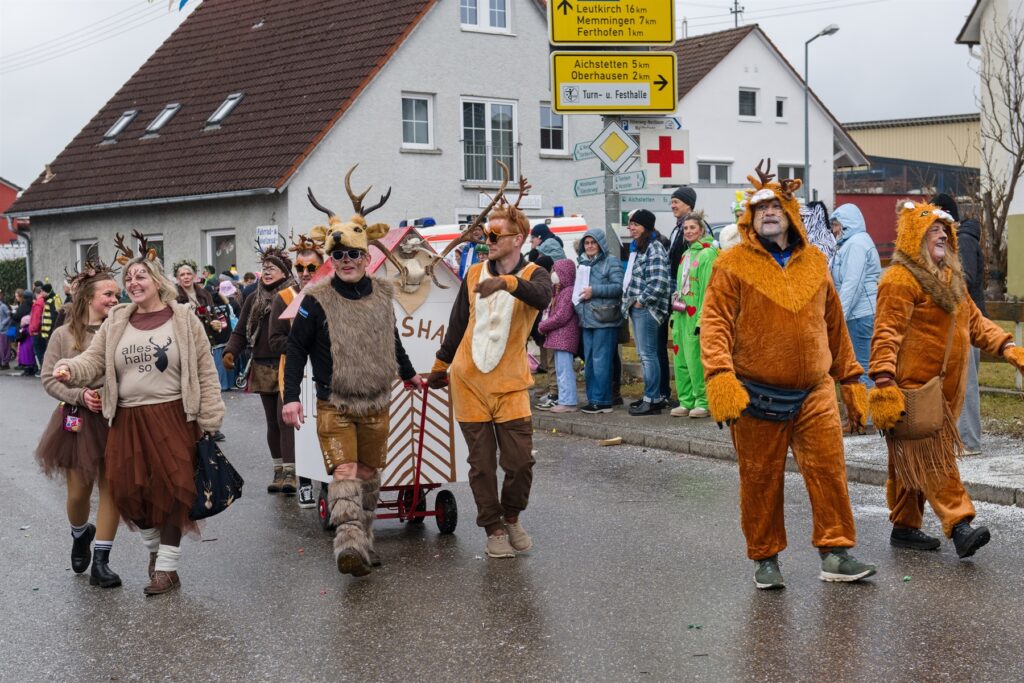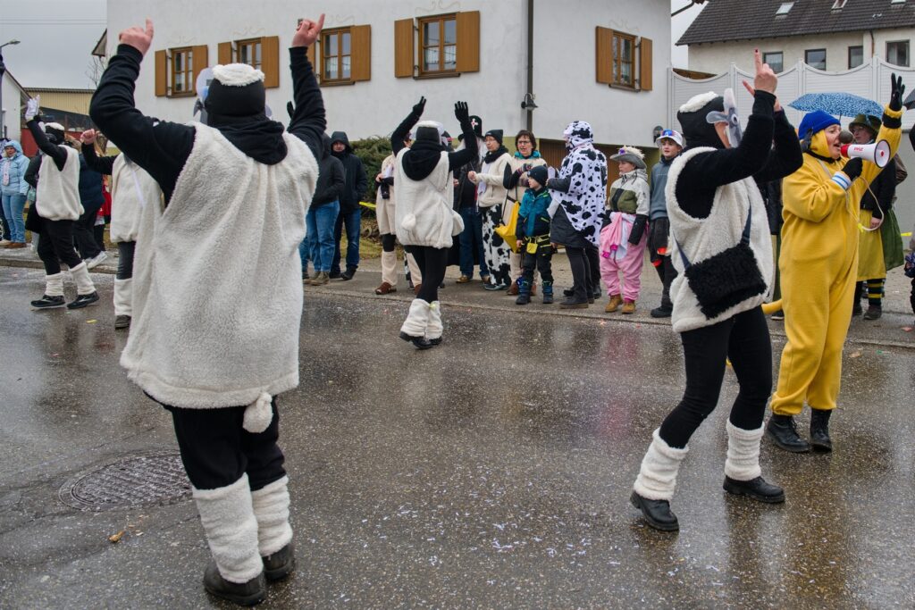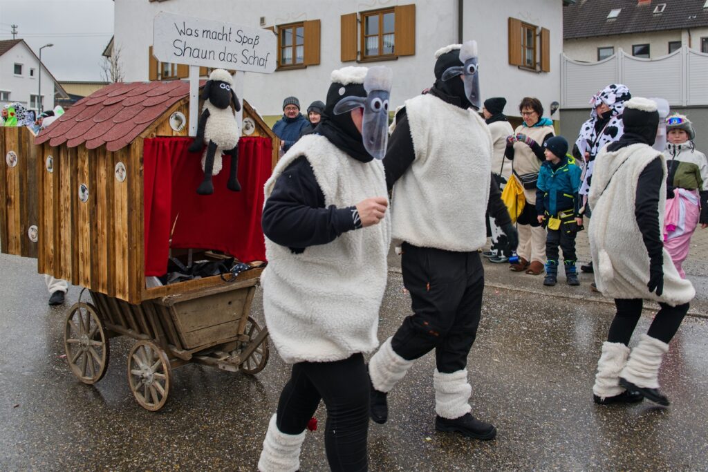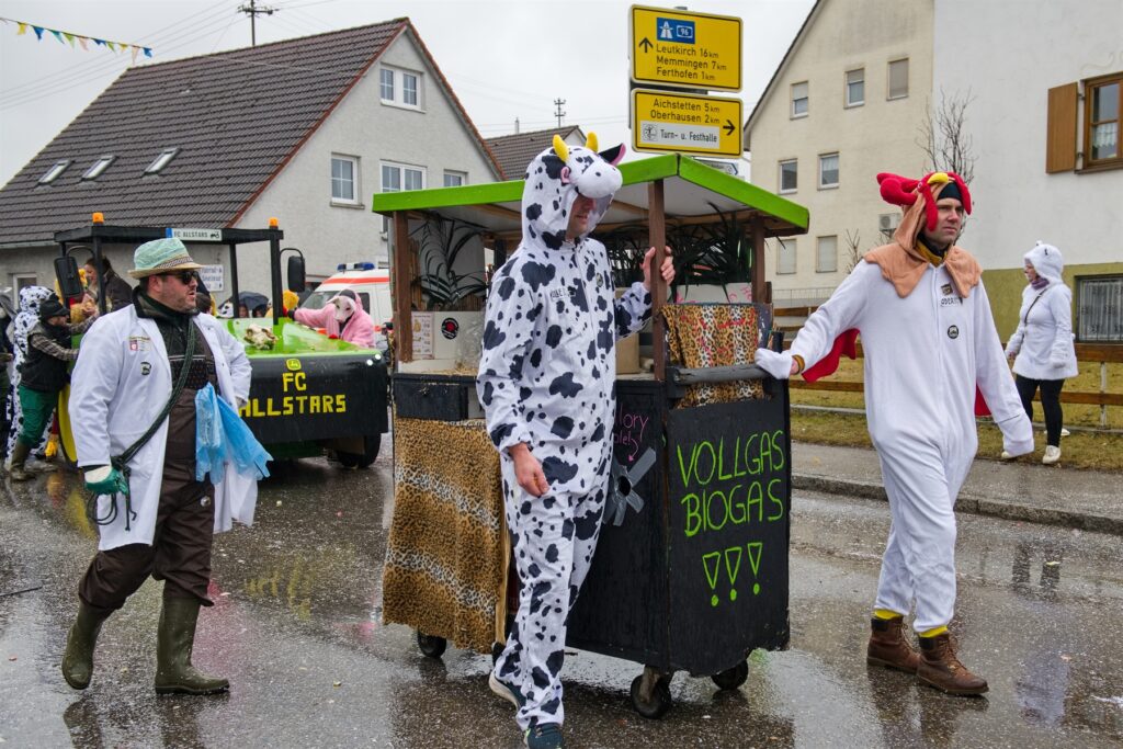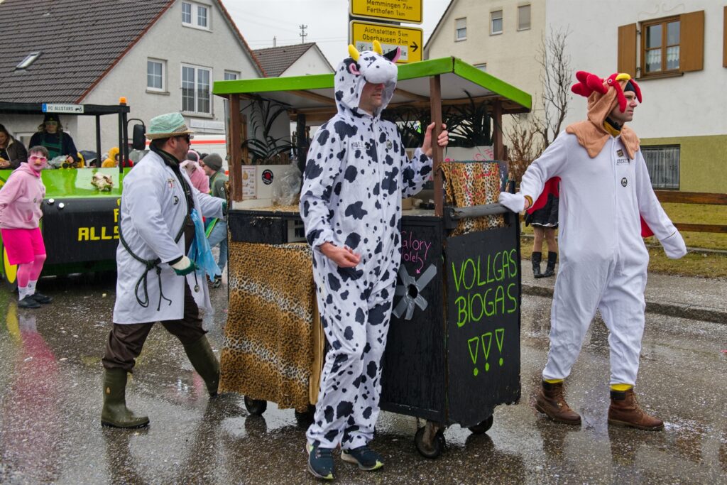 „Gruber und Freunde“ erinnerten auf dem Bauernhof, was macht Spaß: „Schaun das Schaf“. Die Bannwald Narren Vogelscheuchen, Stroh im Kopf, der „Royale Freundeskreis “Steck da Kopf it en da Sand – d`Straußa send omanand“. Der „Förderverein der glückseligen Fasnet“ bedauerte Löwen ade – Hirsch Juhee. Die Aitracher Fußballer als FC Allstars „Ackerbau und Viehzucht und Biogasanlage. MV Aitrach und Freunde – Aitracher Stallfliegen „Fluiga Dätschr“.
