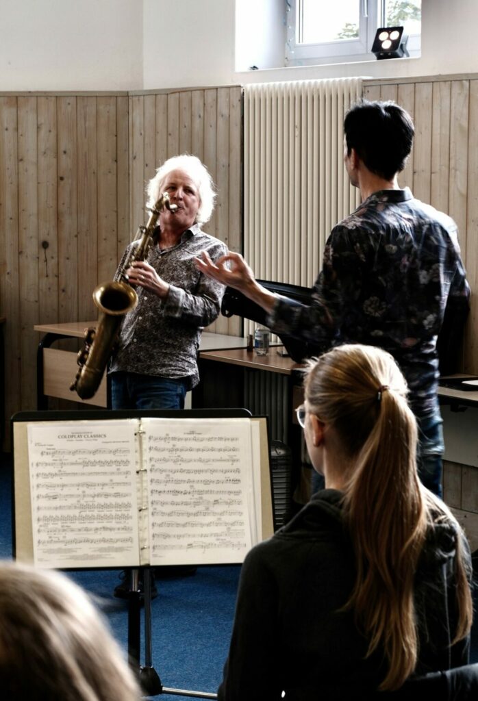 Peter Lehel vertiefte derweil die rhythmische und solistische Komponente. Ein besonderes Highlight war die Einheit zum Thema Improvisation. In einem packenden „Call and Response“Dialog zwischen Lehel und dem regulären Leiter der Big Band, Severin Hänsler (Trompete), wurde Theorie lebendig. Inspiriert durch dieses Vorbild konnte die Schülerschaft im Anschluss selbst aktiv werden: In einer vereinfachten Version probierten sich die Jugendlichen an eigenen „Antworten“ im Call-and-Response-Stil aus. Dabei lernten sie nicht nur die Grundlagen von Harmonielehre und Blues-Tonleitern, sondern vor allem, wie man musische Begeisterung auf die Bühne bringt. Lehel und Halder zeigten auf, wie wichtig die eigene Energie ist, um den Funken auf das Publikum überspringen zu lassen.