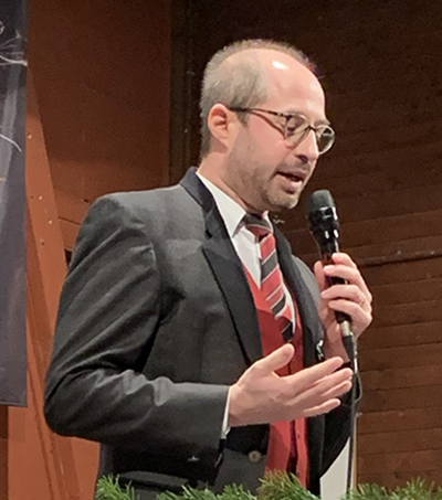 Teil II begann mit dem traditionellen Grußwort von Bürgermeister Matthias Burth (Bild). Er wünschte allen Aulendorfer Familien zum neuen Jahr Frieden und Zuversicht trotz weltweiter Krisen und Kriege. Statt Zukunftspessimismus sei doch Aufbruch angesagt. Als gutes Vorbild nannte er das inzwischen mehr als 160-jährige Wirken der Stadtkapelle, die Zusammenhalt, Rücksicht und Beständigkeit pflege. Was gibt denn Halt und was kommt auf uns alles zu, fragte der Bürgermeister.  Nur Miteinander, Füreinander oder Zusammenhalt sei es! Burth nannte Beispiele aus dem nunmehr vergangenen Jahr: das Große Narrentreffen, das Schloss- und Kinderfest, 75 Jahre Stadterhebung und anderes mehr. Dies zeige doch, was mit ehrenamtlichem Engagement möglich ist. Beispielsweise habe die Stadtkapelle als Botschafterin unserer Stadt Verantwortung bewiesen, als sie sich für ein eigenes Probelokal stark machte oder gar die Tiefbauarbeiten im Zuge der Renovierung des Schloss-Innenhofs übernahm. Auch mit dem schmerzlichen Verlust ihres sympathischen Dirigenten Martin Rebmann musste sie lernen, umzugehen. Burth dankte auch Hermann Stehle für die nötig gewordene Übernahme des Taktstocks. Zum Abschluss seines Grußworts trug er das bis heute aktuelle und witzige Neujahrsgebet des Pfarrers von St. Lamberti in Münster aus dem Jahr 1883 vor, wofür er großen Beifall erntete.