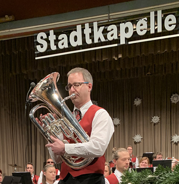 „Carrickfergus“, arrangiert von Michael Geisler, war ein weiterer Ausflug auf die grüne Insel Irland. Dabei handelt es sich um eine dort typische Volksweise. Ein darin enthaltenes Euphonium-Solo von Simon Dittberner (Bild) war sicher ein zusätzliches Highlight des Abends. Der Solist spielte völlig frei, also „notenlos“ und absolut lupenrein, wofür es langen Applaus gab.