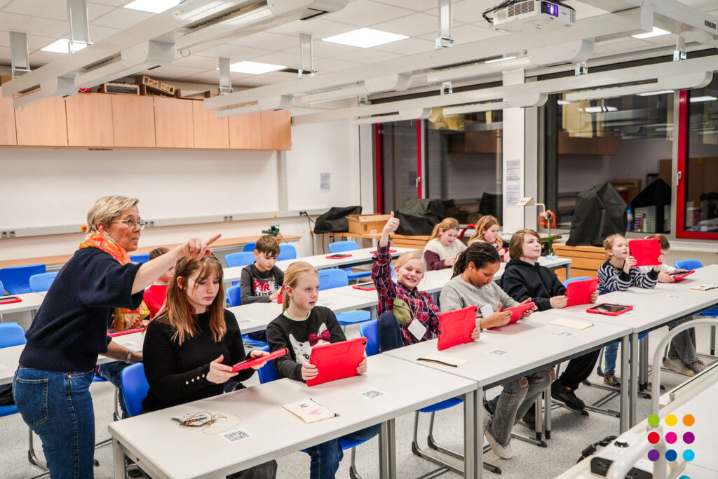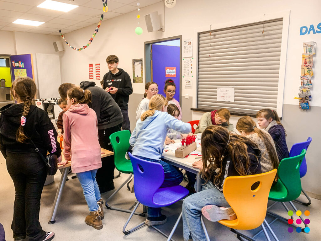 Währenddessen erkundeten die interessierten Grundschulkinder mit engagierten Schülerinnen und Schülern der Klassen 8 und 9 als Mentoren das Schulhaus im Rahmen einer Rallye.