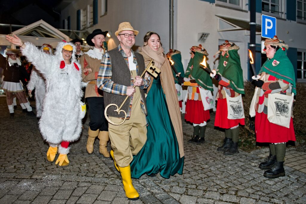 Aitrach – Abschied von den Amtsstuben: Bürgermeister Thomas Kellenberger und sein Gemeinderat sind entmachtet. Kelly schafft nun in der Landwirtschaft. Und beaufsichtigt seine Räte als Hühner und Schweine. Nun sind die Narren in Aitrach an der Macht. Die zahlreichen Zuschauer vor dem Rathaus mussten nicht lange warten, bis sich der als Bauer verkleidete Rathauschef der Öffentlichkeit zeigte.