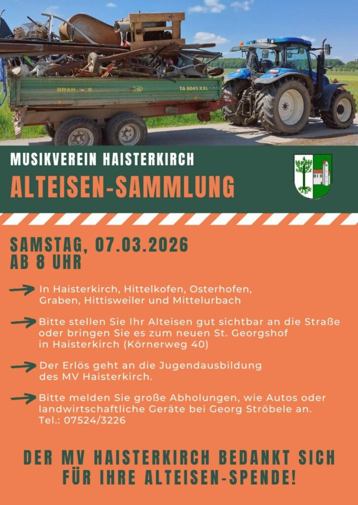 Haisterkirch – Am Samstag, 7. März, findet die jährliche Alteisen-Sammlung des Musikvereins Haisterkirch statt. Ab 8.00 Uhr wird in Haisterkirch sowie in den umliegenden Ortschaften Hittelkofen, Osterhofen, Graben, Hittisweiler und Mittelurbach Alteisen gesammelt.
