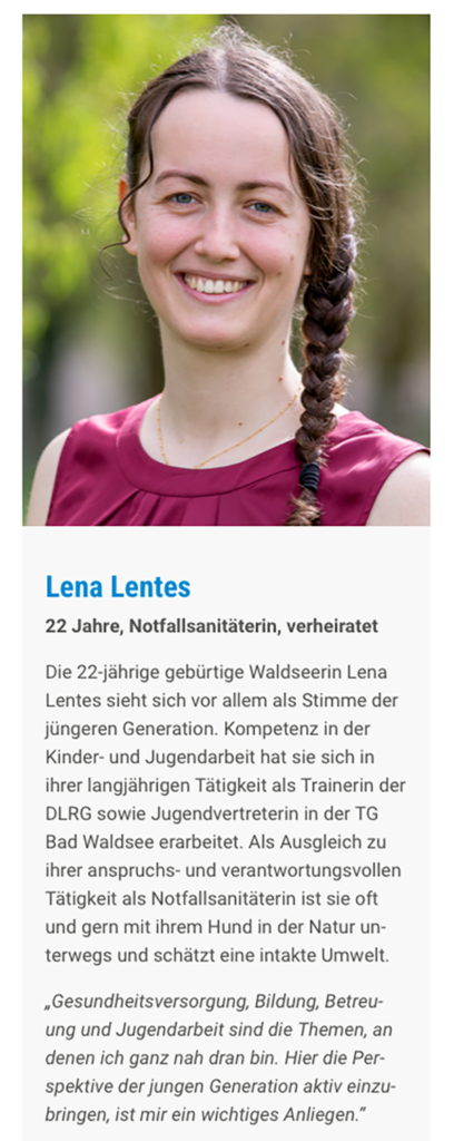 Lena Lentes rückt für den verstorbenen Franz Daiber nach. In der Sitzung am 2. Februar wird sie verpflichtet. Das Bild mit dem zugehörigen Text haben wir dem Wahlprospekt der Freien Wähler vom Juni 2024 entnommen.