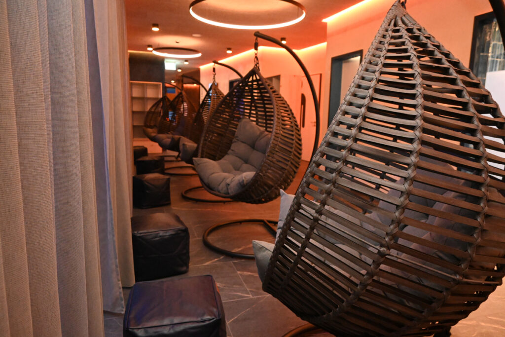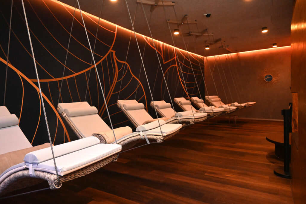 Mehrere Ruheräume wurden zusammengeführt und neu gestaltet. Die PanoramaLounge bietet moderne Liegen und viel Weitblick, während die SchlossseeLounge mit Hängeliegen und einem auffälligen „goldenen“ Kamin königliche Entspannung verspricht. Im SeeHaus lädt die StadtseeLounge mit eindrucksvollem Stadtsee-Motiv zum Verweilen ein – denn Ruhe ist in der Sauna genauso wichtig wie das Schwitzen.