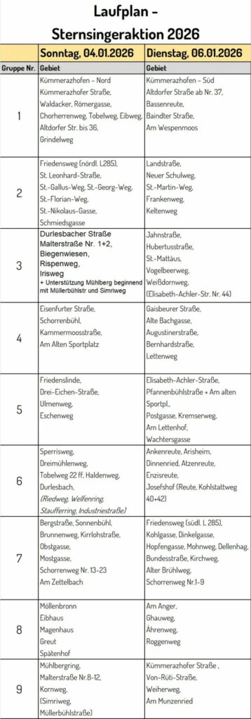 Anm. d. Red.: Auch in den drei anderen Pfarrgemeinden der Seelsorgeeinheit Bad Waldsee sind Sternsinger unterwegs. Die Bildschirmzeitung „Der Waldseer“ wurden aber keine weiteren Infos zugeleitet. Den Laufplan für die Kirchengemeinde Reute (mit Gaisbeuren) haben wir der Webseite der Seelrorgeeinheit entnommen.