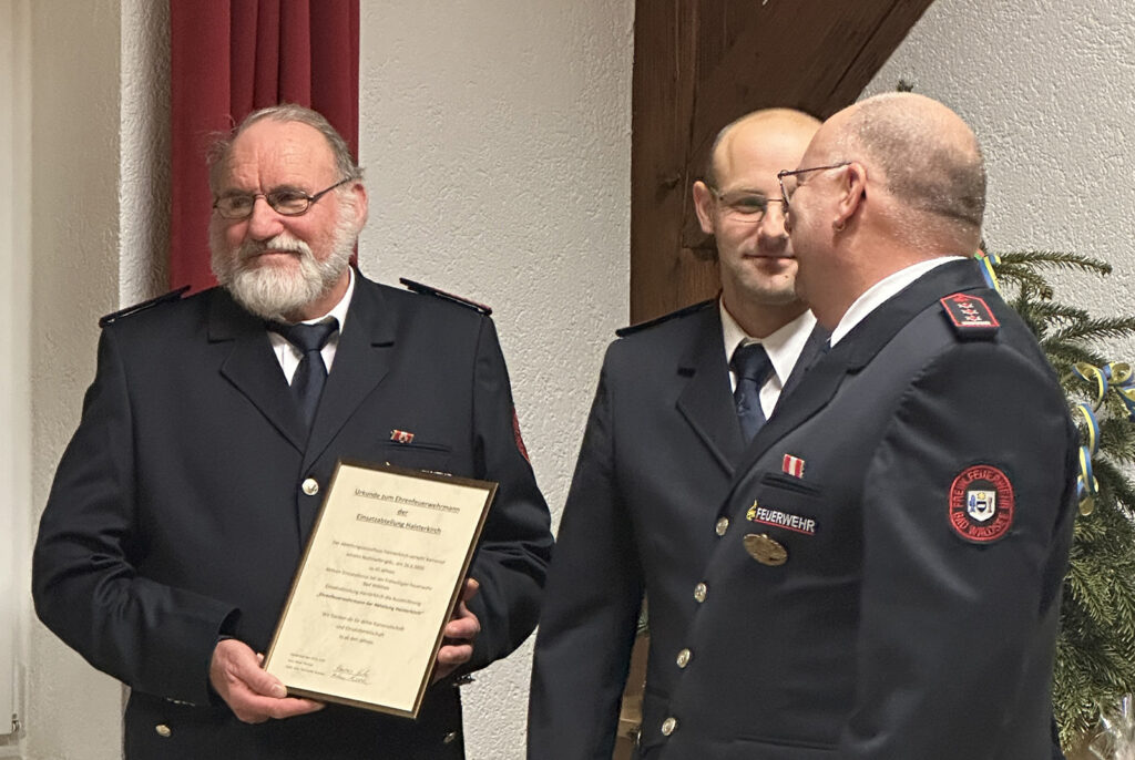 Wurde zum Ehrenmitglied der Haisterkircher Feuerwehr ernannt: Johann Nothhelfer. Der stellvertretende Abteilungskommandant Andreas Nothhelfer und Abteilungskommandant Thomas Heber haben dem verdienten langjährigen Mitglied soeben die Urkunde überreicht. Foto: FFW