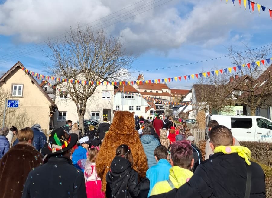 Zahlreiche bunt verkleidete Kinder und Erwachsene schlossen sich dem Zug an, der – wie jedes Jahr – vom Fanfarenzug angeführt wurde. Mit kräftigen Klängen und viel guter Laune bahnte sich die Gruppe ihren Weg durch die Straßen bis zum Dorfplatz. Große Begeisterung lösten die Kanoniere aus, die mit ihrer Narrenrakete wieder reichlich Süßigkeiten und Konfetti in die Menge schossen.