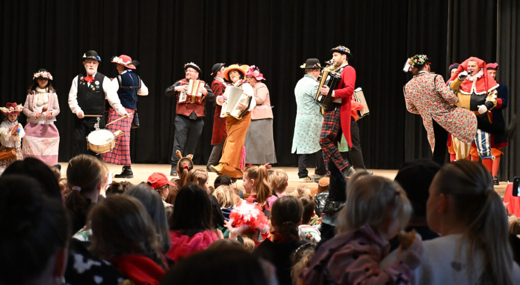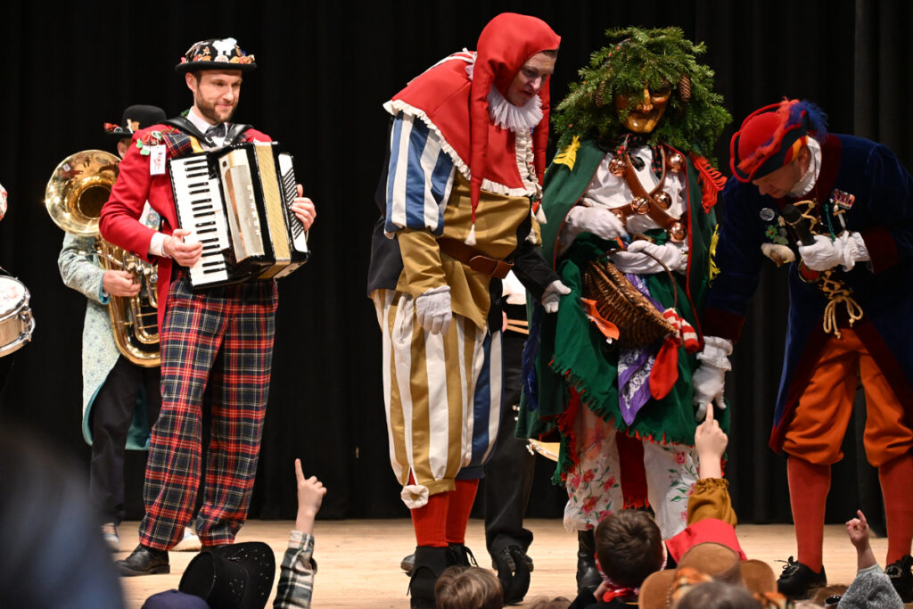 Für großes Erstaunen sorgte ein kunterbuntes Mäschkerle, an dem alles „verkehrt“ war: Maske vom Schorrenweible, Umhang vom Federle, Korb vom Narro, Hosen vom Faselhannes und Rock vom Schrättele – von jeder Waldseer Figur ein bisschen. Gut, dass anschließend die echten Maskenträger zeigten, wie man sich richtig anzieht.