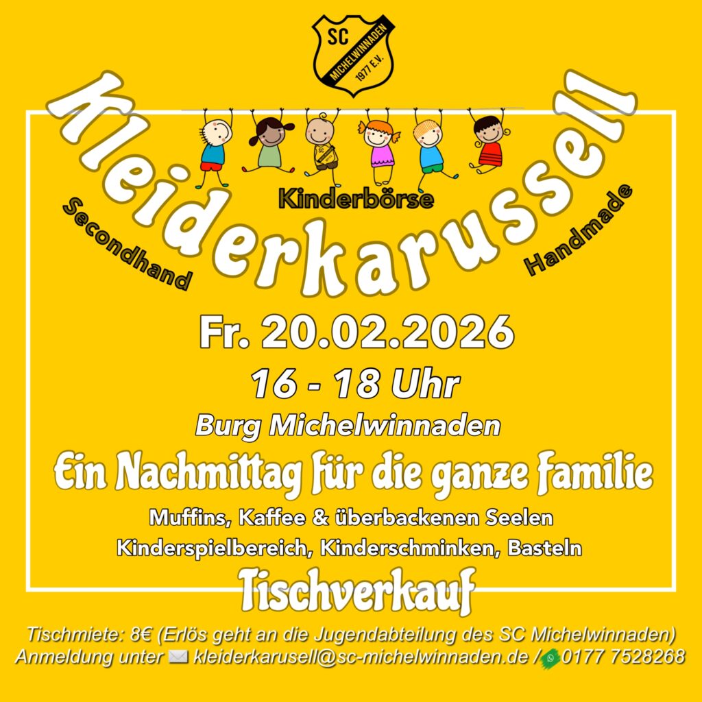 Standanmeldungen für „Kleiderkarussell“ werden unter 0177 7528268 oder unter kleiderkarusell@sc-michelwinnaden.de entgegengenommen. Die Standgebühr beträgt 8 €, der Erlös geht an die Jugendabteilung.