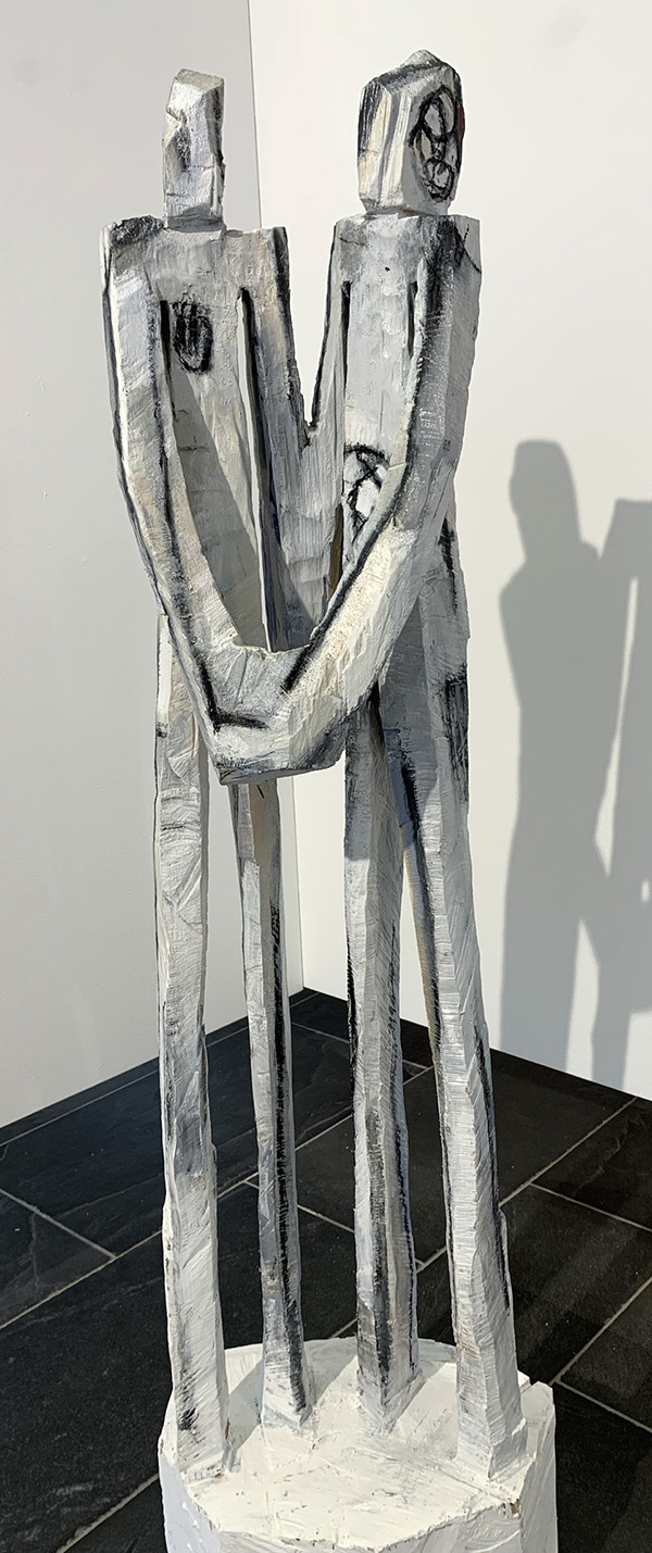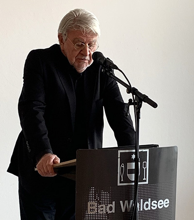 Axel Otterbach (Bild) erinnerte in seiner Begrüßung an den Skulpturensommer 1989 in Bad Waldsee. Unter den damals geladenen Bildhauern war auch Terence Carr mit seiner farbigen Skulptur „Someone“. Dies war die Zeit, als Skulpturen aus unterschiedlichsten Materialien wieder mit Farbe Aufwertung erhielten. Selbst zunächst mit Kettensäge entstandene Skulpturen Carrs werden durch aufwändige Bemalung filigran und detailreich, so Otterbach. In seinen Arbeiten überschreite der Künstler Grenzen zwischen Figuration und Abstraktion oder eben auch zwischen Skulptur und Malerei.