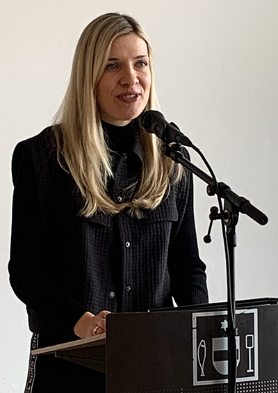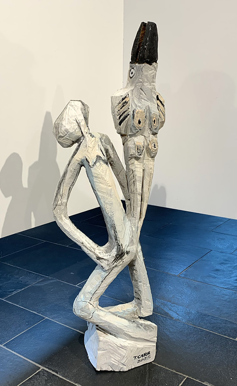 Die Kunsthistorikerin Natalie Carr (Bild) übernahm die Laudatio zum Schaffen ihres Ehegatten Terence Carr. Sie teilte seine künstlerische Prägung in drei Lebensabschnitte: Terence Carr – der Mensch, Terence Carr – der Krieger und Terence Carr – der Künstler. Alle drei seien in seiner Bildsprache, seiner Motivik und seiner Farbigkeit zu erkennen. Aufgewachsen ist Terence Carr in einem katholischen Internat in Ostafrika. Schon als Kind zeigte er Interesse an Sport und an künstlerischen Aktivitäten. Statt seines gewünschten Kunststudiums ging er auf Wunsch seines Vaters zur renommierten britischen Militärakademie Sandhurst, wo er eine Offizierskarriere durchlief. Erfahrungen und Spuren als Krieger prägten ihn während des Bürgerkriegs in Nordirland, wie Wahrheit, Verletzlichkeit und Fragilität menschlicher Existenz. Erst eine Verlegung nach Norddeutschland und späterer Quittierung des Militärdienstes mit Verbleib in Deutschland führte ihn zum Künstlerischen, eine schicksalhafte Wendung, so Natalie Carr. Terence Carr nahm ein Kunststudium auf, womit auch sein Kampf um Existenz und Anerkennung allein durch Kunst begann. Zunächst arbeitete er als figurativer Maler realistischer Zeichnungen. Dann wandte er sich der Abstraktion zu – über das Material Holz zu eigenen Welten. So thematisierte er den Menschen im Geflecht seiner gegenseitigen Beziehungen. Nähe, Zusammenhalt, Distanz oder Vereinzelung werde damit gezeigt. Auch mit unserer Spaßgesellschaft mit wenig Verantwortung, aber mit Selbstoptimierung, Konsum und moralischer Selbstgewissheit befasste sich der Künstler kritisch und möchte das sichtbar machen.