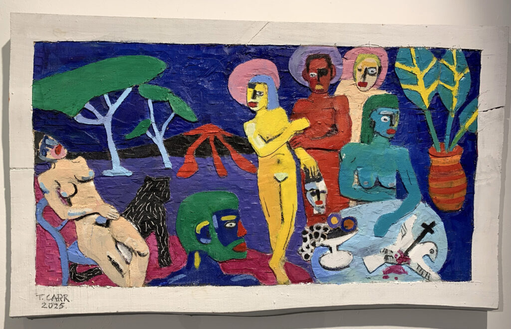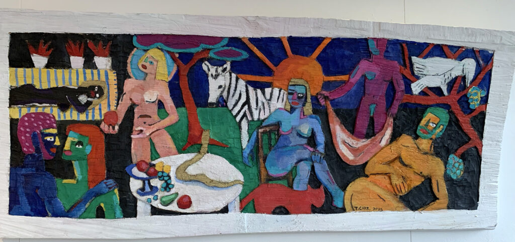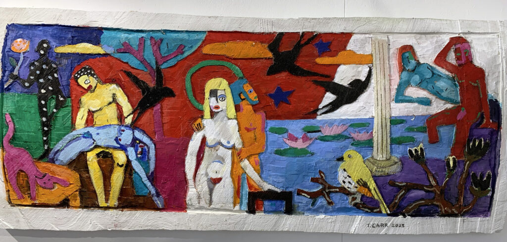 Dieses Anliegen verfolge der Künstler auch in seinen neueren Holzreliefs in lebendiger und kraftvoller Farbigkeit. Christliche Werte werden hier auf den Kopf gestellt, Figuren erscheinen entblößt bzw. entheiligt. Natalie Carr sieht darin zeitgenössische Gegenaltäre einer Gesellschaft, die ihre christlichen Werte noch nicht (?) verloren hat, sondern sie bewusst umkehrt. Ob mit diesen Darstellungen eine Erneuerung der Werte gefunden wird, überlässt Terence Carr wohl dem jeweiligen Betrachter.