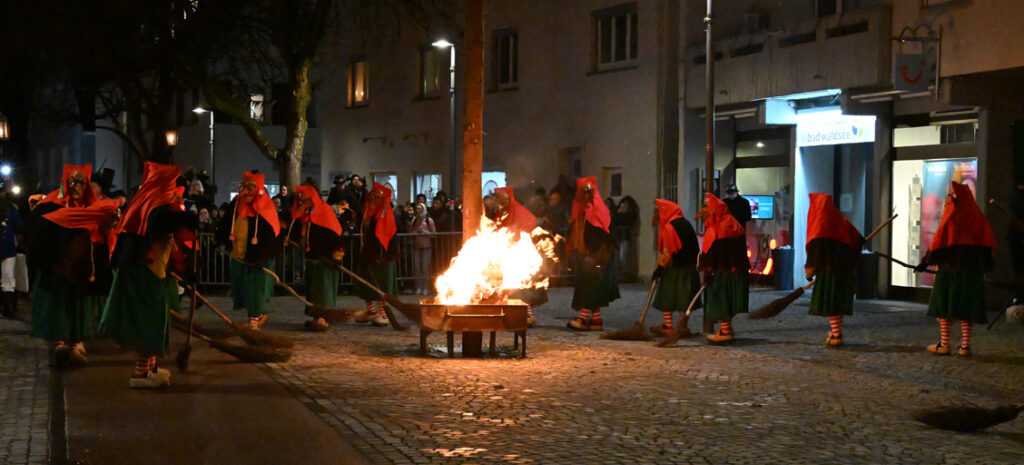 Auf der Hochstatt lodert das Feuer am Narrenbaum und die Schrättele verbrennen unter lautem Wehklagen ihre Besen. Danach zieht man weiter zum Schlossbach. Von der Brücke aus wird der Narr schließlich den Fluten übergeben – das endgültige Zeichen für das Ende der Fasnet.