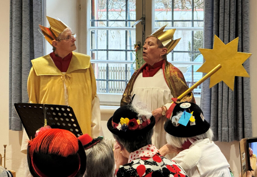Die Vorsitzende des Seniorenclubs Marianne Ploil begrüßte mit einer wegweisenden Büttenrede die Anwesenden, während ihre Kolleginnen vom Service-Team fleißig Kaffee einschenkten und Kuchenstücke verteilten. Auch Pfarrer Stefan Werner von der Seelsorgeeinheit Bad Waldsee war gekommen und wusste als Astronaut und „Himmelspilot“ Wohlgereimtes zu verkünden. Camilla und Irmgard waren als Sternsingerinnen unterwegs und hatten viel Närrisches zu berichten. Auch Christa als Urschwäbin und Gertrud als Schorrenweible halfen fest mit, die Lachmuskeln zu lockern. Für die Vortragenden gab es stets anerkennenden Applaus.