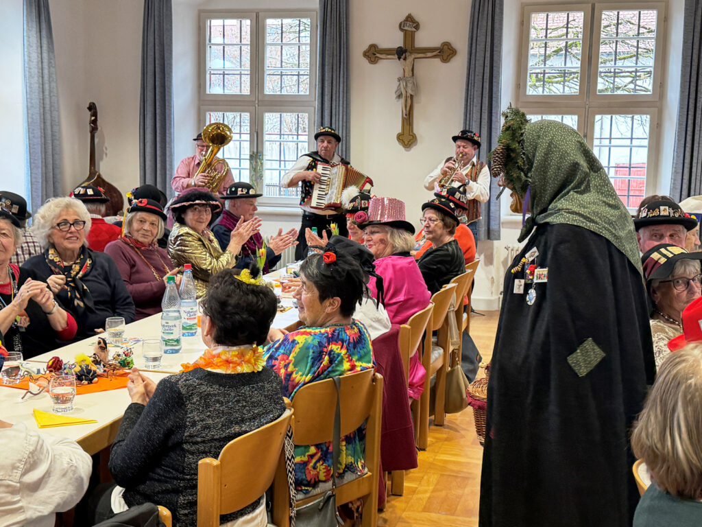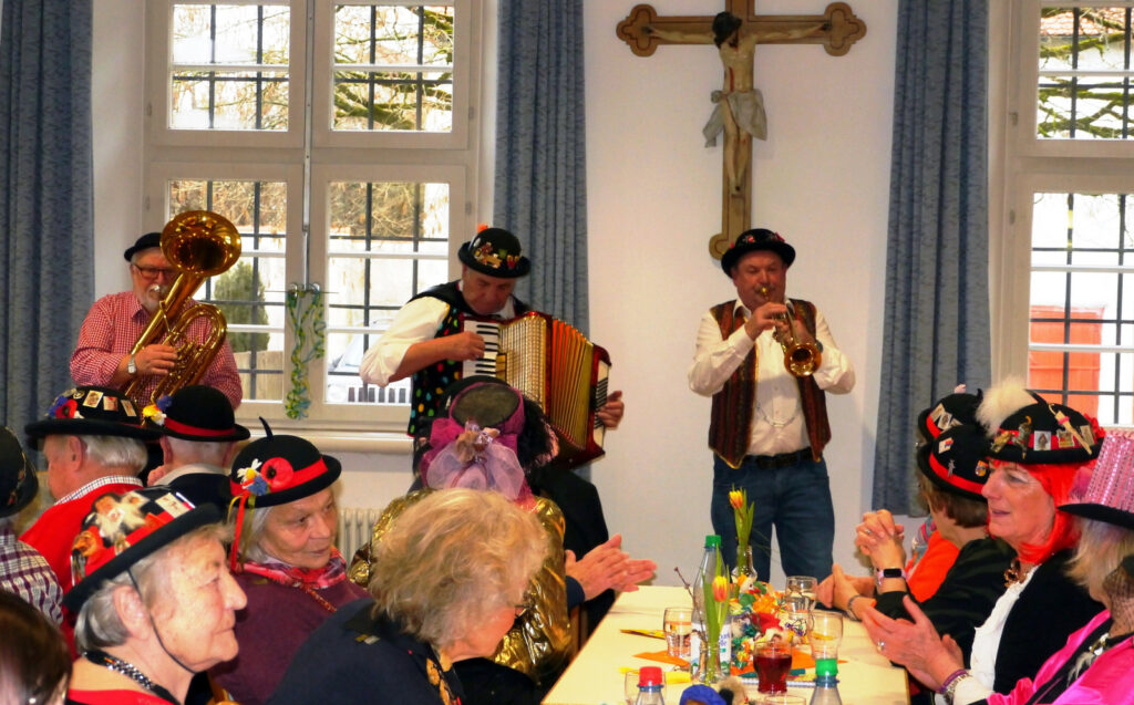 Zur närrischen, musikalischen Programmgestaltung konnte erneut das Trio Franz Gapp (Trompete) aus Bad Waldsee, Frank Miller (Kontrabass) aus Schwendi, Franz Spehn (Akkordeon) aus Mittelurbach gewonnen werden. Die drei verstanden es glänzend, mit ihren fastnächtlichen Melodien und Songs die Seniorinnen und Senioren zum Mitsingen und Schunkeln zu bringen. „Die Hände zu Himmel…“ gehörte natürlich dazu. Das Trio sorgte für beste Stimmung, nicht nur durch ihre hinreißende Musik, sondern auch durch Witze und Anekdoten des Waldseer Moderationskünstlers Franz Gapp. Letztlich wurden alle Gäste zum Schmunzeln und Lachen gebracht. Komplimente gab es an diesem Nachmittag für alle Mitwirkenden und Programmgestalter zuhauf. Eingeladen zu diesem Seniorennachmittag waren Seniorinnen und Senioren aus dem gesamten Gemeindebereich, unabhängig von einer Konfessionszugehörigkeit. Die Schar der Seniorinnen und Senioren bei den Haisterkircher Seniorennachmittagen ist erfreulich groß, dies zeigt sich nicht nur jetzt in der Fasnetswoche sondern bei jedem monatlichen Treffen.