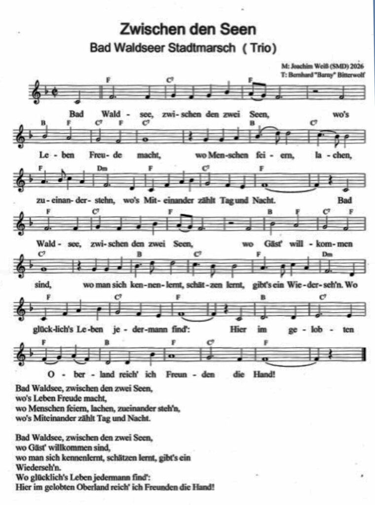 Der Bad Waldseer Stadtmarsch (Melodie: Joachim Weiß, Text: Bernhard Bitterwolf). Das Liedblatt haben wir herabladbar unter „Downloads“ hinterlegt.