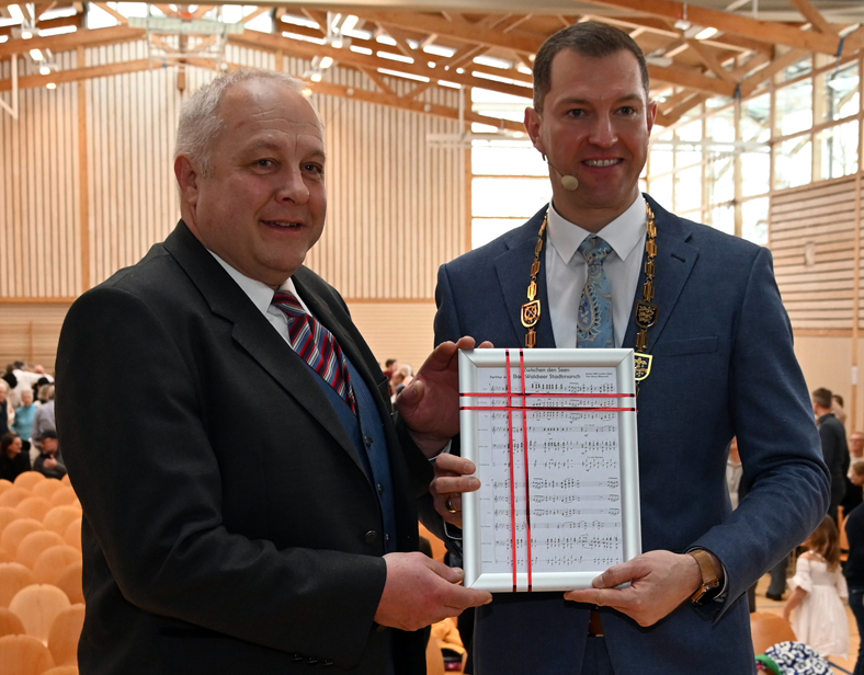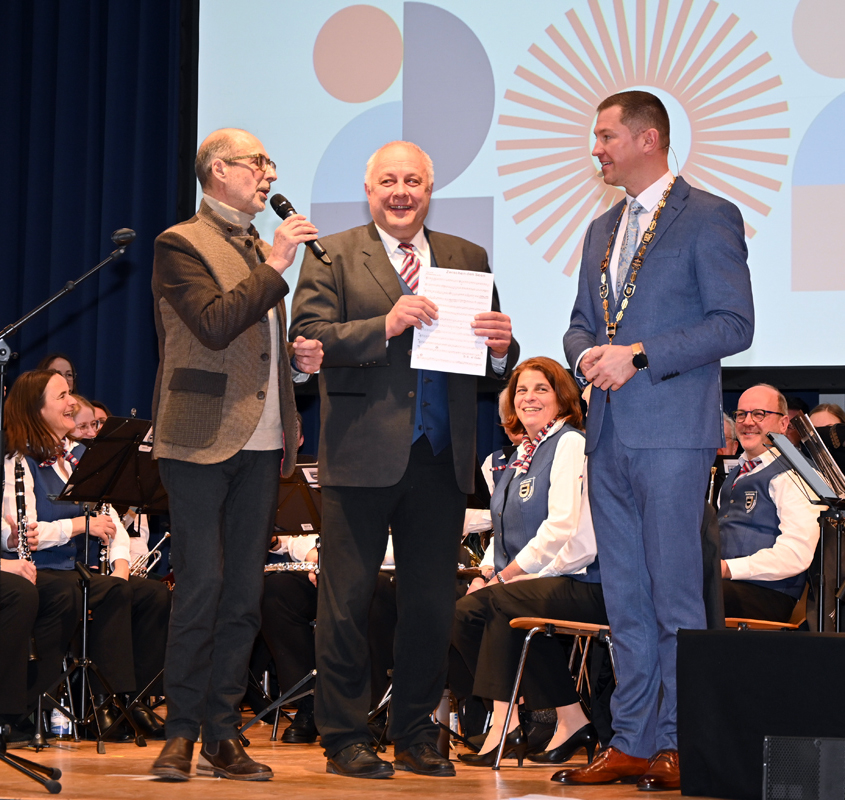 Nachdem Oberbürgermeister Matthias Henne eine gute Stunde referiert hatte, war es wahrlich Zeit für etwas Entspannung – für den Redner und die Zuhörer. Joachim Weiß hatte einen Marsch für Bad Waldsee unter dem Titel „Zwischen zwei Seen“ komponiert, den er, stellvertretend für die ganze Stadt, Oberbürgermeister Matthias Henne zum Geschenk machte. Mit von der Partie war auch Bernhard „Barny“ Bitterwolf, der zur Melodie den Text beisteuerte. Und ganz der große Animateur, brachte Barny mit großem Einsatz in kürzester Zeit den ganzen Saal zum Mitsingen. Die Noten- und Textblätter waren schon vor der Veranstaltung auf allen Plätzen ausgelegen.