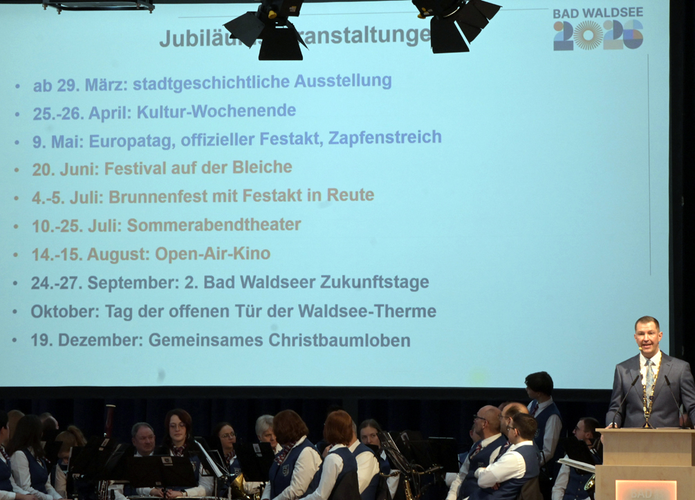 Der Blick richtete sich schließlich auf das Jubiläumsjahr 2026. Bad Waldsee begeht 1100 Jahre urkundliche Erwähnung. In derselben Urkunde wurden auch Reute und Haisterkirch erwähnt, wobei Haisterkirch auch in früheren Urkunden schon in Erscheinung trat. Ehrensberg blickt auf 800 Jahre Geschichte zurück, das historische Rathaus wird 600 Jahre alt und seit 70 Jahren trägt die Stadt den Namenszusatz „Bad“. An dieser Stelle präsentierte der Oberbürgermeister auch das neue Logo für das Jubiläumsjahr und dankte allen Sponsoren für das Engagement. Es sind dies: