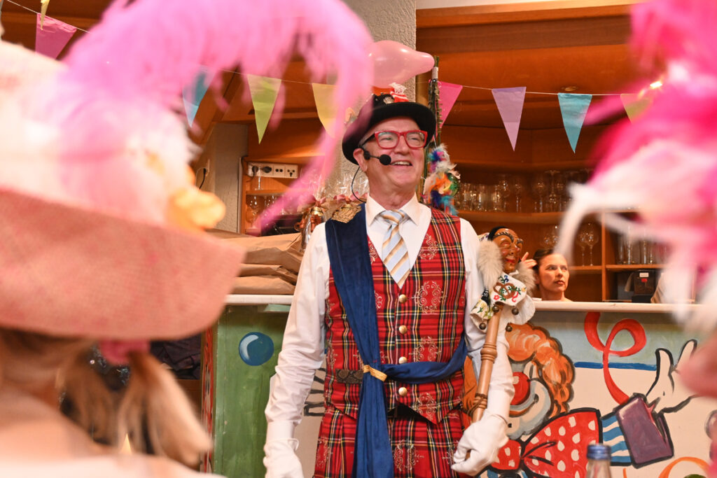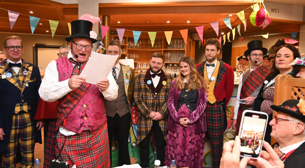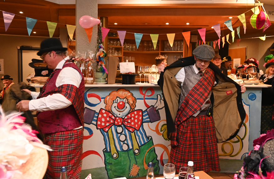 Anschließend nahmen die beiden Zeremonienmeister Andi Hepp und Timo Abler das Heft in die Hand. Die Fasnet spielt sich dieses Jahr auf der britischen Insel ab. Und so suchten die beiden den Spaß an der Freud zunächst als Sherlock Holmes und Dr. Watson. Doch wie von Zauberhand warfen sie ihre Detektiv-Verkleidung ab und kamen als waschechte Schotten in Kilts und roten Karos zum Vorschein.