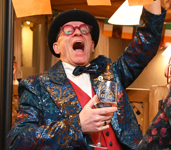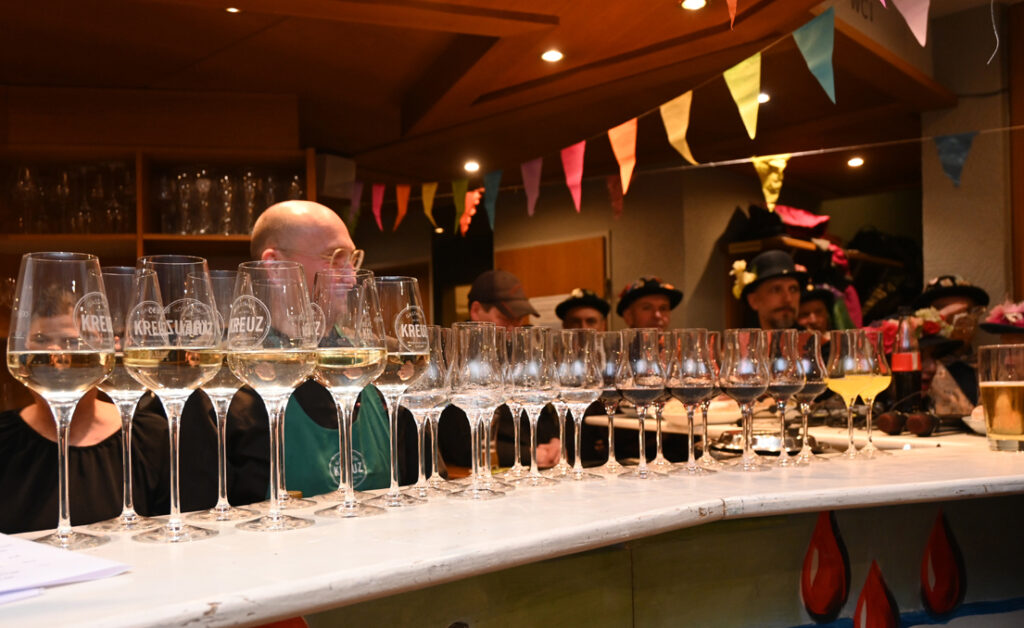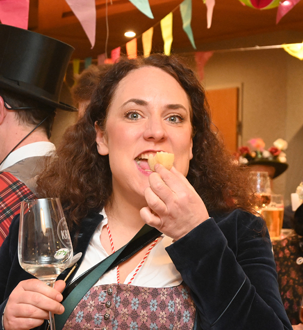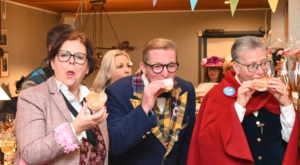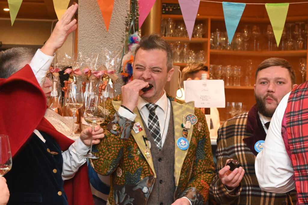 Jetzt galt es, die Jungsammler, die sich die letzten beiden Jahre als Lehrlinge auf Probe bewähren mussten, einer theoretischen und praktischen Prüfung zu unterziehen. Zeremonienmeister Andi Hepp hatte wie jedes Jahr ein kniffliges, witziges Quiz zusammengestellt. Alle Prüflinge bestanden diesen Teil der Prüfung mit Bravour. Und die Praxis? An den Sammeltagen ist es bei den Haltstationen nett und gemütlich, aber der Sammeltag hat halt nur 24 Stunden. Und da muss man die festen und flüssigen Leckereien schnell vereinnahmen. Unter „Mir sottet, mir sottet“-Rufen wurden die Prüflinge auch in diesem Jahr wieder mit den obligatorischen lukullischen Genüssen konfrontiert. Auf den Berliner schnell ein Gläschen Sekt, zum Rollmops ein Schnäpsle, zur Schwarzwurst einen Schluck Wein und zum Harzer Roller noch einen süßen Likör. Ein Sammlermagen muss es ertragen. Und so konnten die neuen Sammler ins Völkle aufgenommen werden und erhielten mit Hut und Häs die Insignien, die „aus einem gewöhnlichen Menschen einen Sammler machen“.