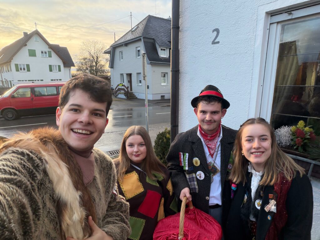 Zuvor hatten die Mitglieder der Narrengilde Reute bereits der Raiffeisenbank einen Besuch abgestattet, bevor es weiter zur Schule und anschließend in die beiden Kindergärten ging. Die Narrengilde hatte es sich zur Aufgabe gemacht, die Kinder vom Unterricht zu befreien. Mit lautem Getöse und fröhlicher Schnurrermusik zog die Zigeunergruppe mit den Scherenschleifern durch die Klassenzimmer. Unterstützt wurden sie dabei von einigen Maskenträgern der Narrengilde.