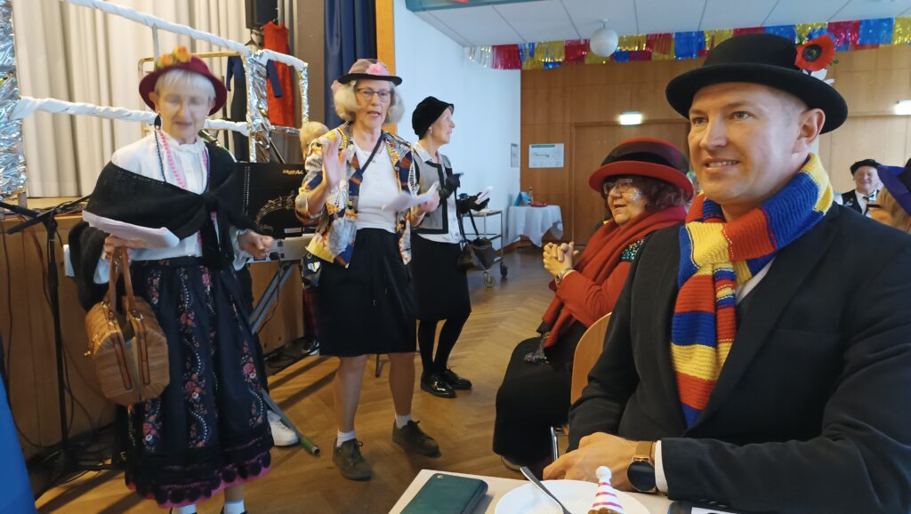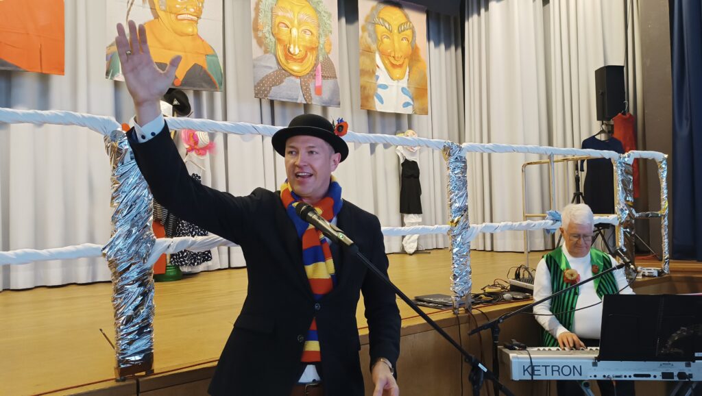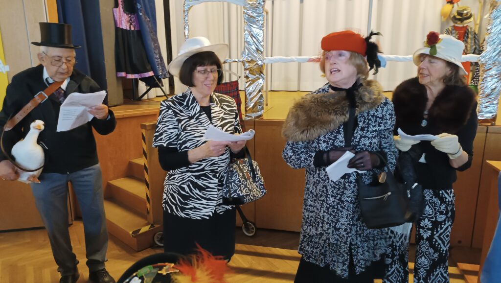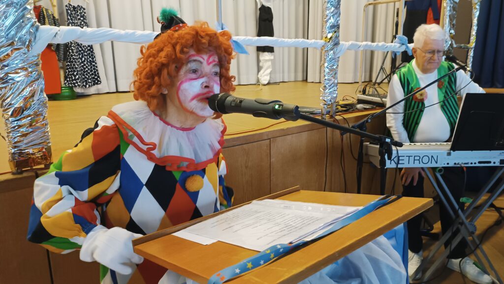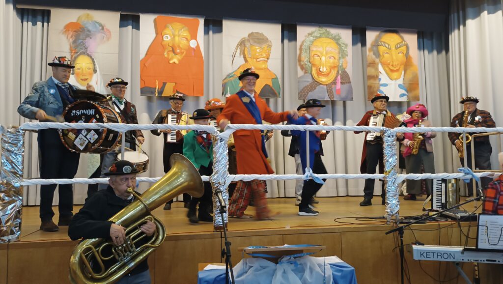 Zum Auftakt eroberte Lydia Ettenhofer als Clown und ihren akrobatischen Turneinlagen die Bühne und ließ die Stimmung steigen. Mir sind die Feschtgäns vom Ort, wo ebbes los ischt kommet mir sofort, uns entgoht nix, nix, nix was intressiert drum hond mir au doher pressiert.“ So konnten die Seniorentreff-Akteurinnen mit diesem Ohrwurm die Gäste zum Miteinstimmen animieren.
