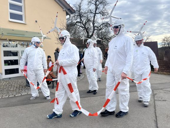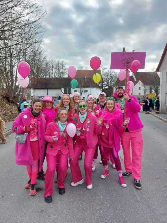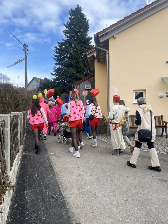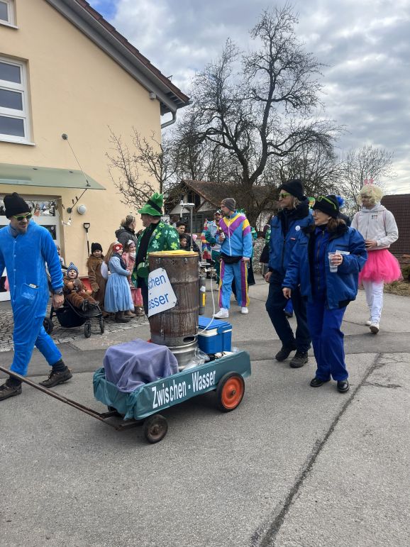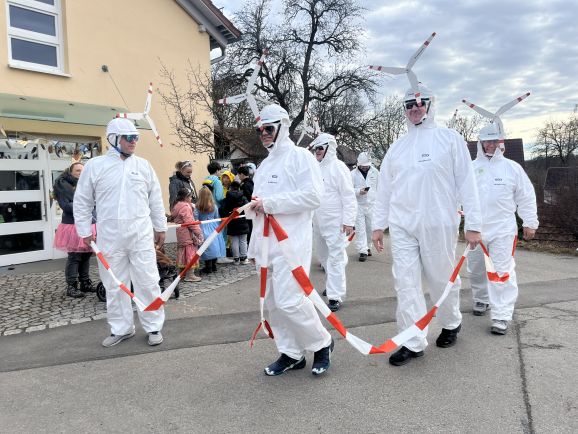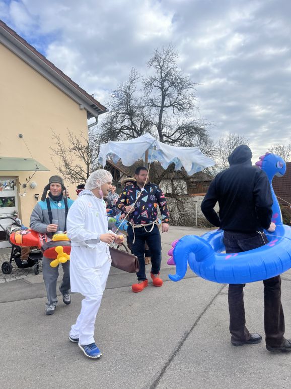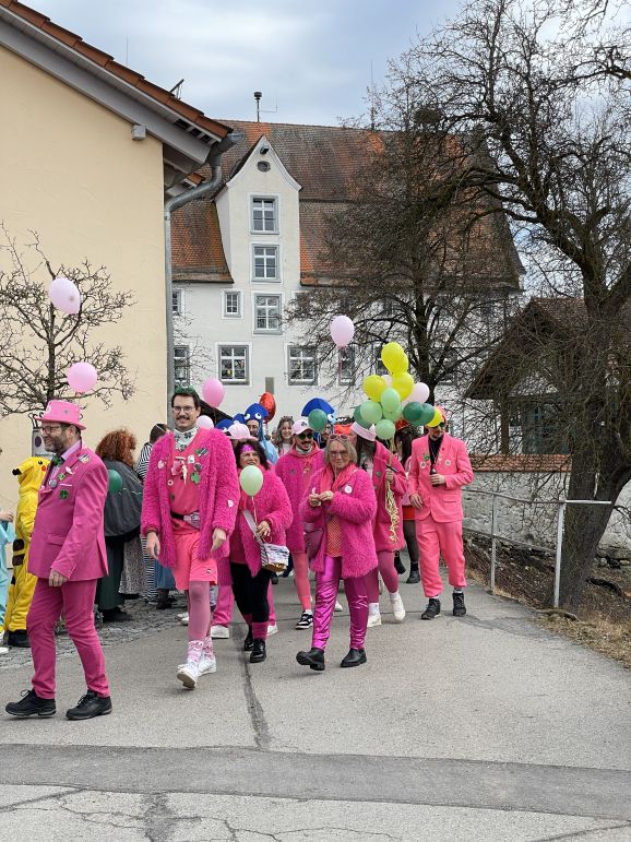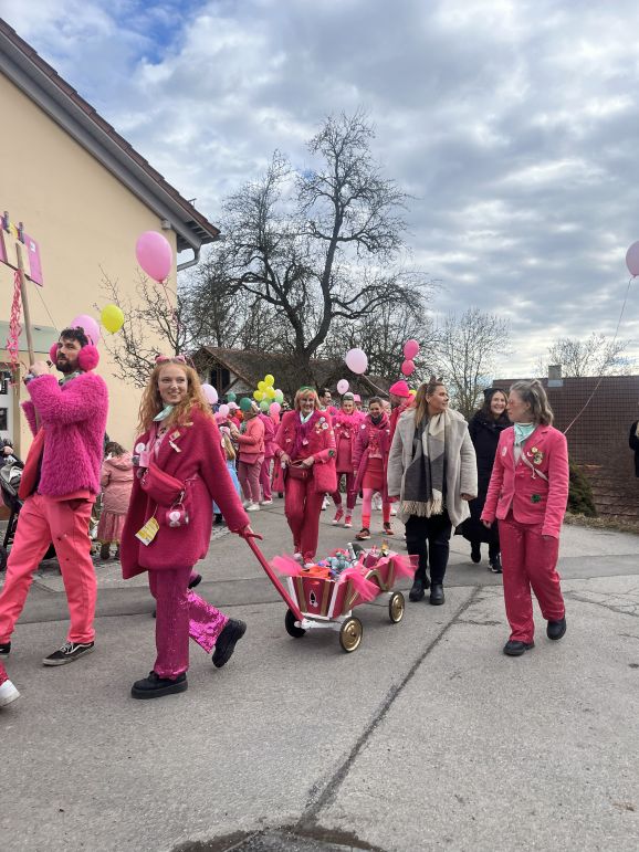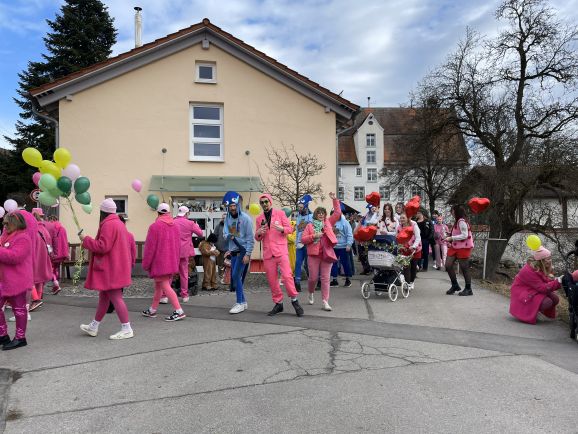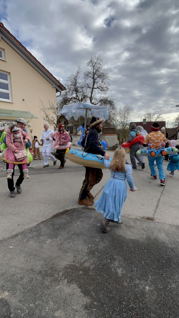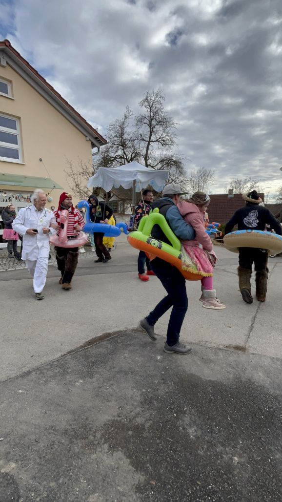 Am Nachmittag folgte dann der Höhepunkt: der allseits beliebte Umzug, organisiert vom SC Michelwinnaden. Wieder einmal hatten etliche Gruppierungen sich tolle Verkleidungen überlegt: Eine Schar Pinker Panther, eine Gruppe von Oktupussen, Zwischenwasser, Windräder und ein Kinderkarussell waren nur einige der vielen fantasievollen und kreativen Kostüme. Hippies, Regenbogen, Feen, Ärzte, Schafe, Maler, Kobolde, Prinzessinnen, Pommery Miwiööö, Zundermariechen – alles war dabei! Die bunte Schar, angeführt von der Kindergarde und dem Musikverein Michelwinnaden, zog vom Burghof in Richtung Kirche zur ersten Verpflegungsstation.