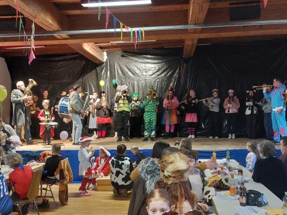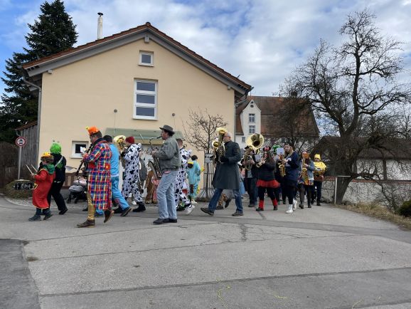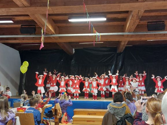 An den etlichen Haltepunkten im Ort wurde kräftig geschunkelt und getanzt. Anschließend ging es zurück in den fasnachtlich dekorierten Burgsaal. Hier konnte die Kindergarde nochmals ihre einstudierten Tänze zum Besten geben und auch der Musikverein sorgte für beste Stimmung. Nachdem die Tanzbühne für die Kinder freigegeben wurde, konnte der Nachmittag bei guter Bewirtung losgehen. Ab 18.00 Uhr öffnete das Sportheim dann seine Türen zur Sportheimparty und auch der Fanfarenzug Tannhausen sorgte am Abend noch für gute Stimmung.