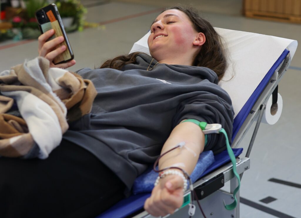 Franziska Greiner surft auf ihrem Handy während der Blutspende. Unseren Recherchen zufolge lernt sie für eine Prüfung.