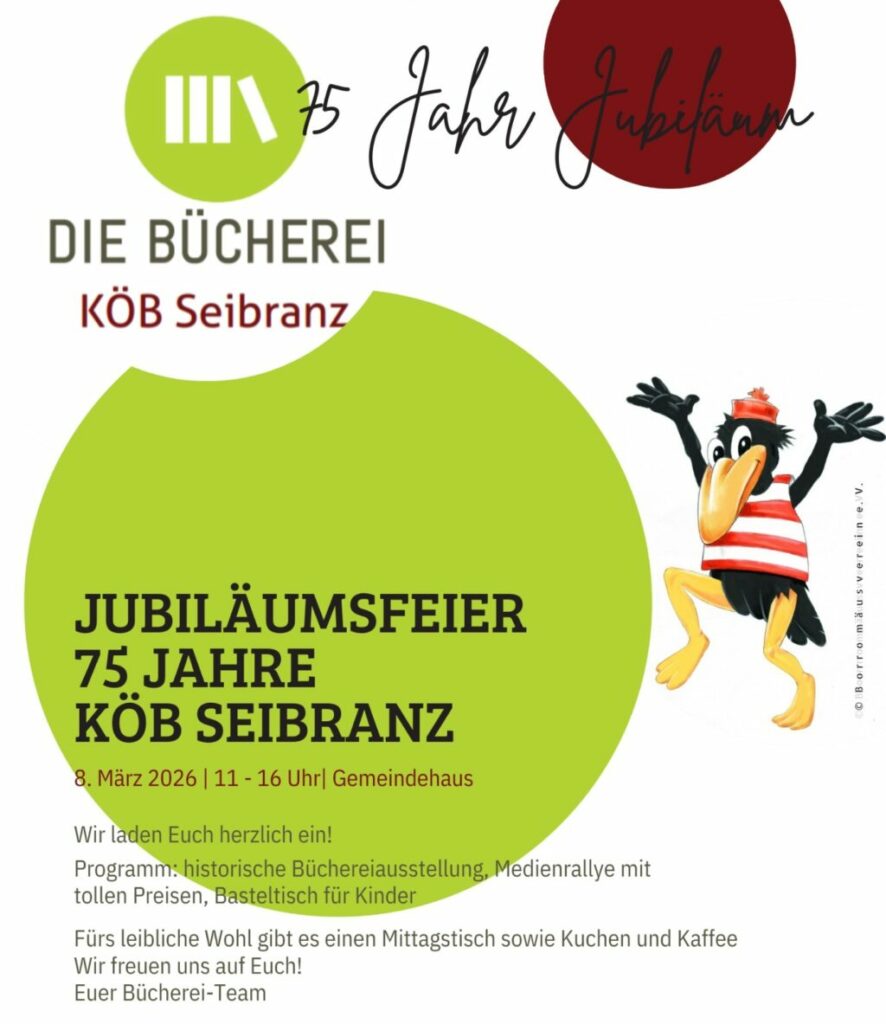 Seibranz: Die Bücherei in Seibranz (KÖB Seibranz) feiert am Sonntag, 8. März, von 11.00 bis 16.00 Uhr im Gemeindehaus ihr 75-jähriges Jubiläum. Mit tollem Programm, unter anderem eine Medienrallye mit tollen Preisen. Auch für das leibliche Wohl ist mit Mittagstisch und Kaffee und Kuchen bestens gesorgt. Siehe nachfolgenden Flyer: