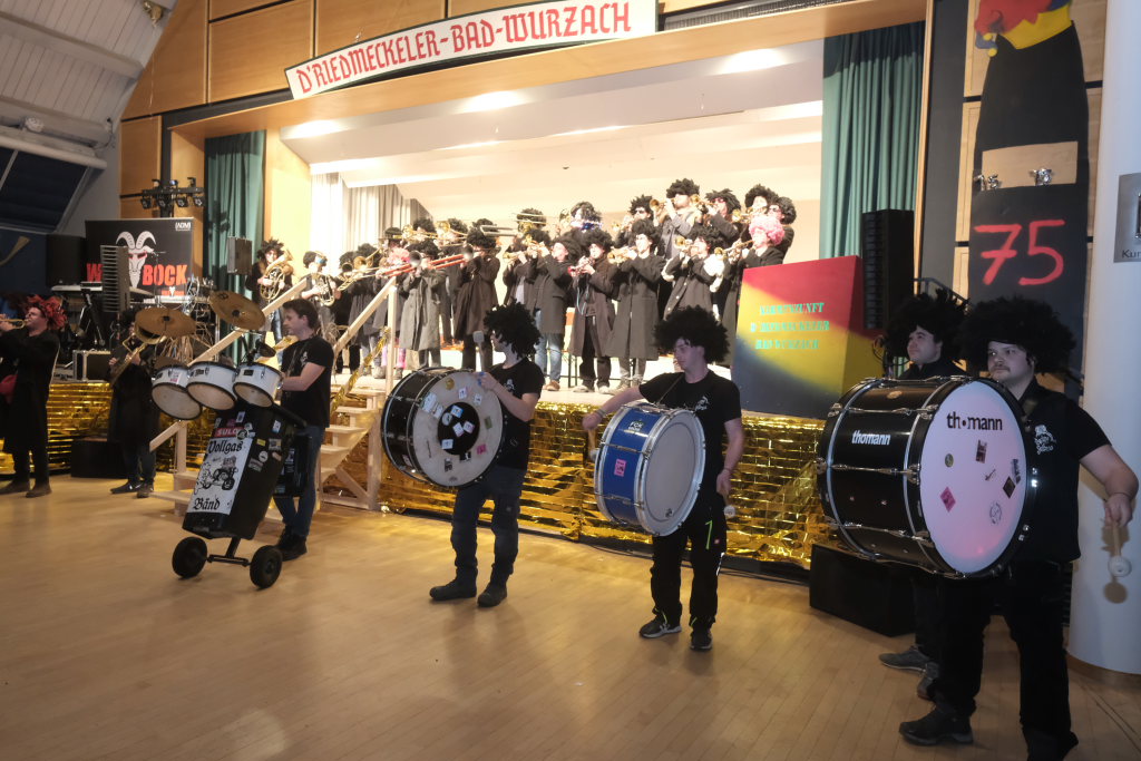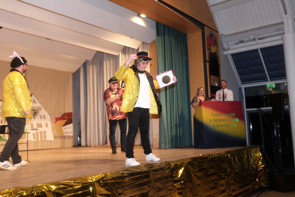 Nachdem die Band schon einige musikalische Runden gedreht hatte, darunter für ein Geburtstagskind namens Heidi das entsprechende Lied aus der Schweiz sowie das obligatorische Happy-Birthday, begrüßte Zunftmeister Dominic Neher das Publikum im Namen der Narrenzunft zu dieser wegen des Jubiläums ganz besonderen Feierabend-Gaudi, durch dessen Programm Kathrin Neher und Markus Birk führten.