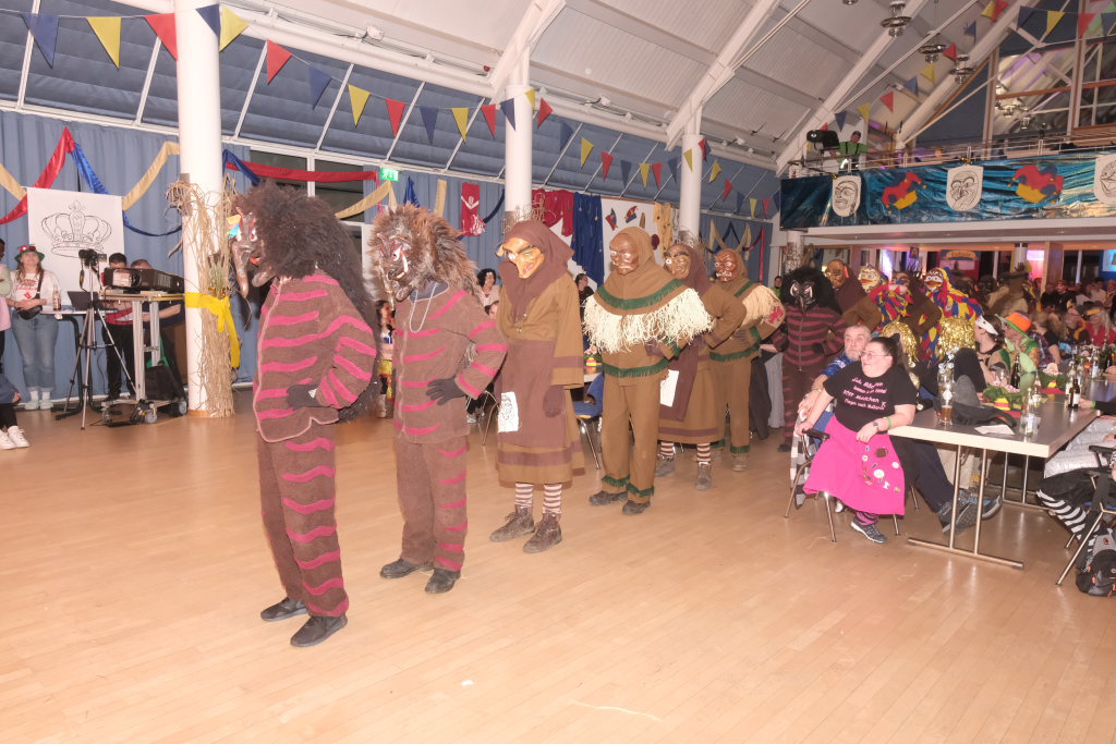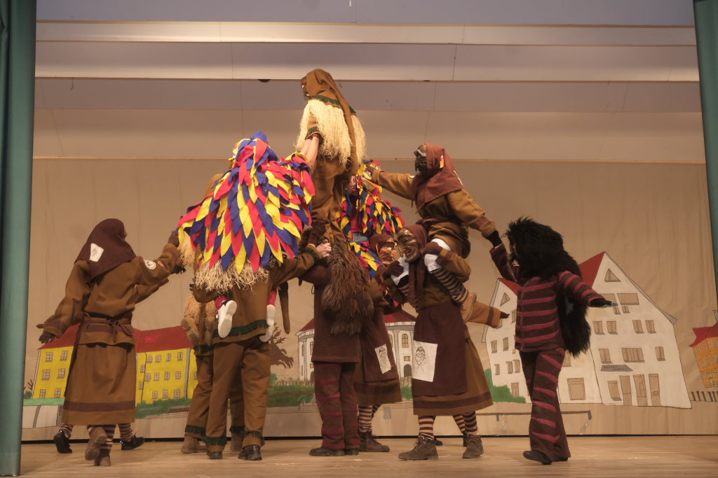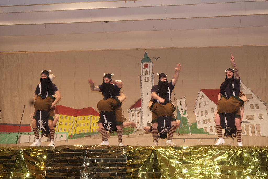 Das Programm eröffneten die Masken der Zunft mit ihrem Maskentanz. Es war eine sportlich-akrobatische Höchstleistung, die die Hästräger auf der Bühne boten. Für die obligatorische und lautstark geforderte Zugabe bauten die Tänzerinnen und Tänzer hinter dem geschlossenen Bühnenvorhang verschiedene Pyramidenkombinationen.