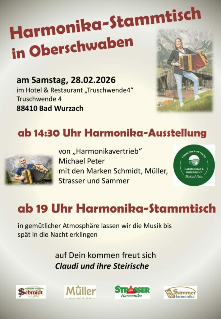Truschwende – Claudia Herdrich macht wieder eine Veranstaltung rund um die Harmonika. Am 28. Februar findet ab 14.30 Uhr eine Harmonika-Ausstellung statt, bei der man viele Marken testen kann. Um 19.00 Uhr beginnt der Stammtisch, bei dem wieder kräftig musiziert wird. Das Ganze findet wieder im T4 in Truschwende statt.