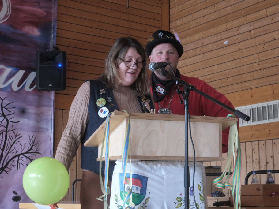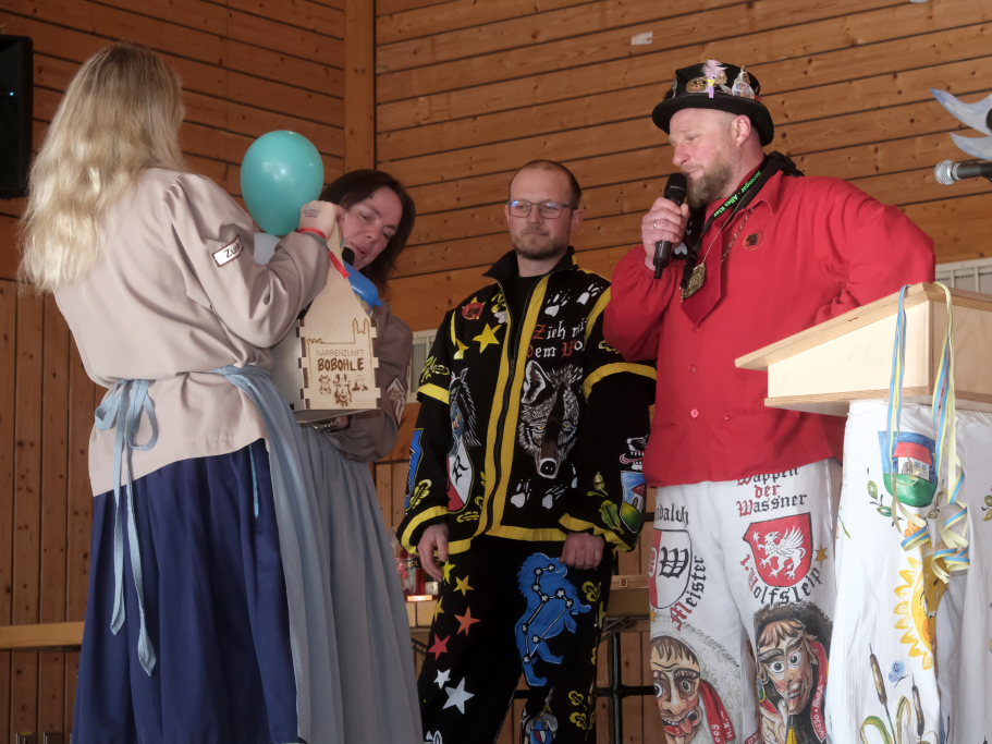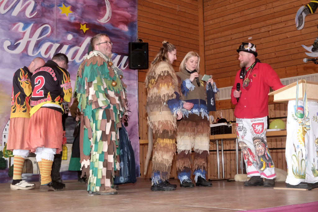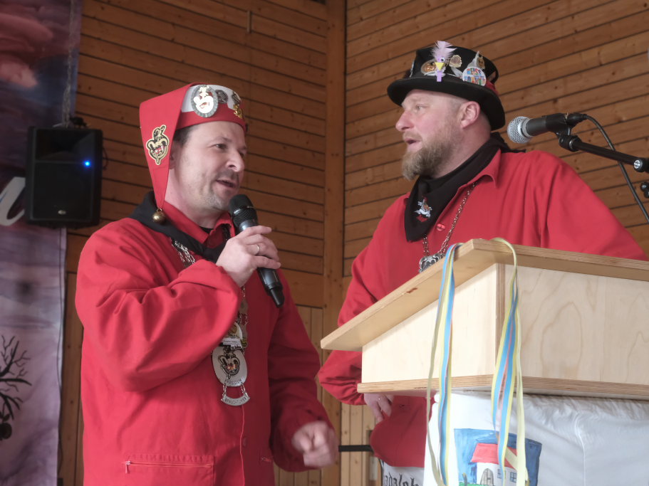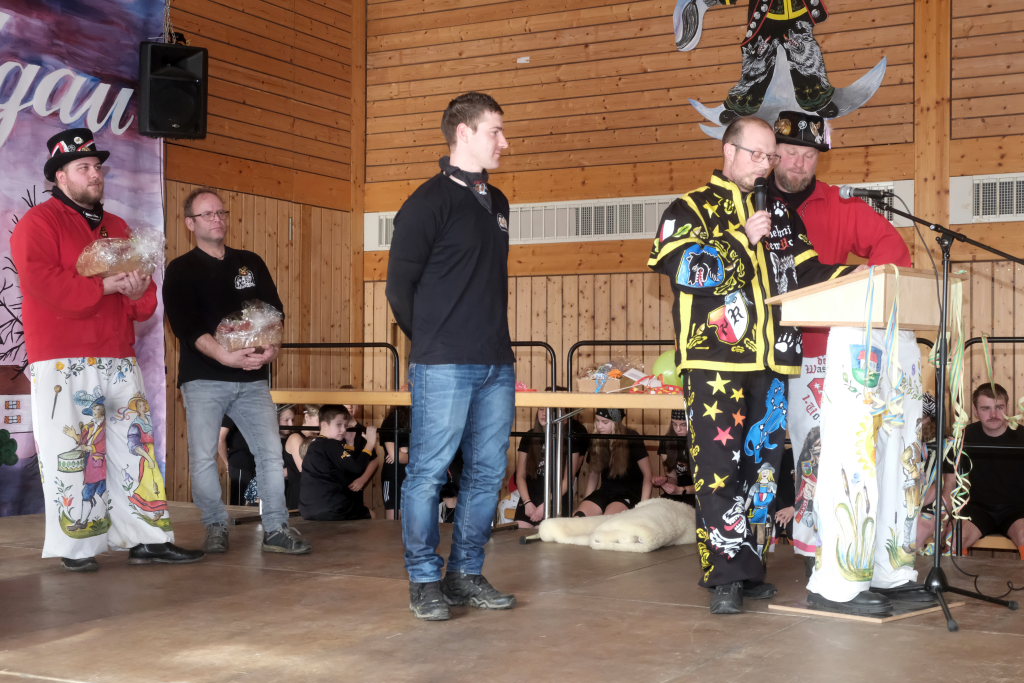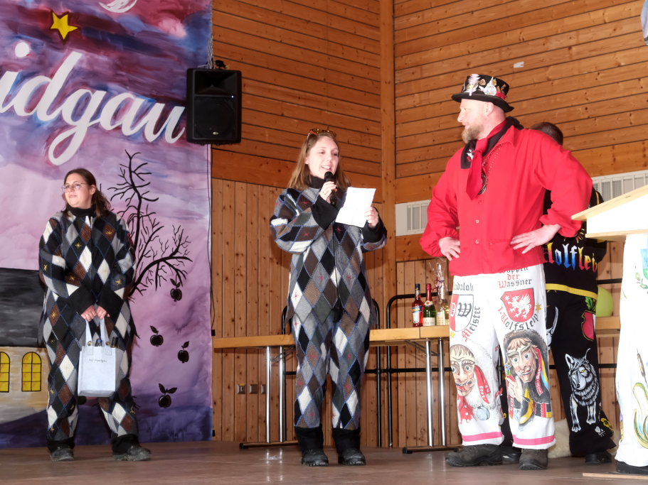 Auch Bürgermeisterin Alexandra Scherer machte der Haidgauer Narrenzunft ihre Aufwartung und übergab, begleitet von einer kurzen Ansprache in Reimform, den Zunftoberen Daniel Wassner und Peter Rösch ihr Gastgeschenk.
