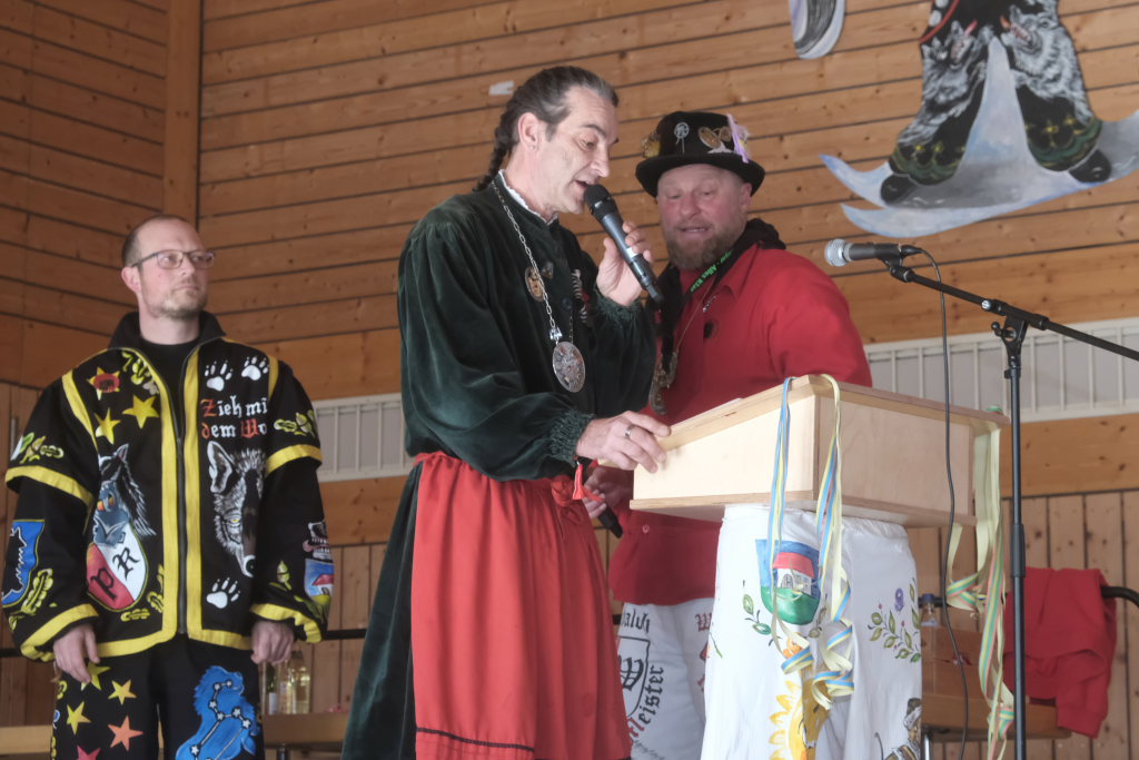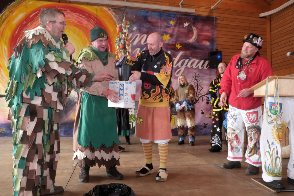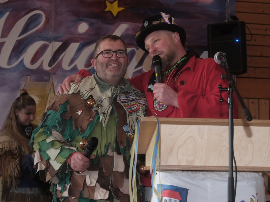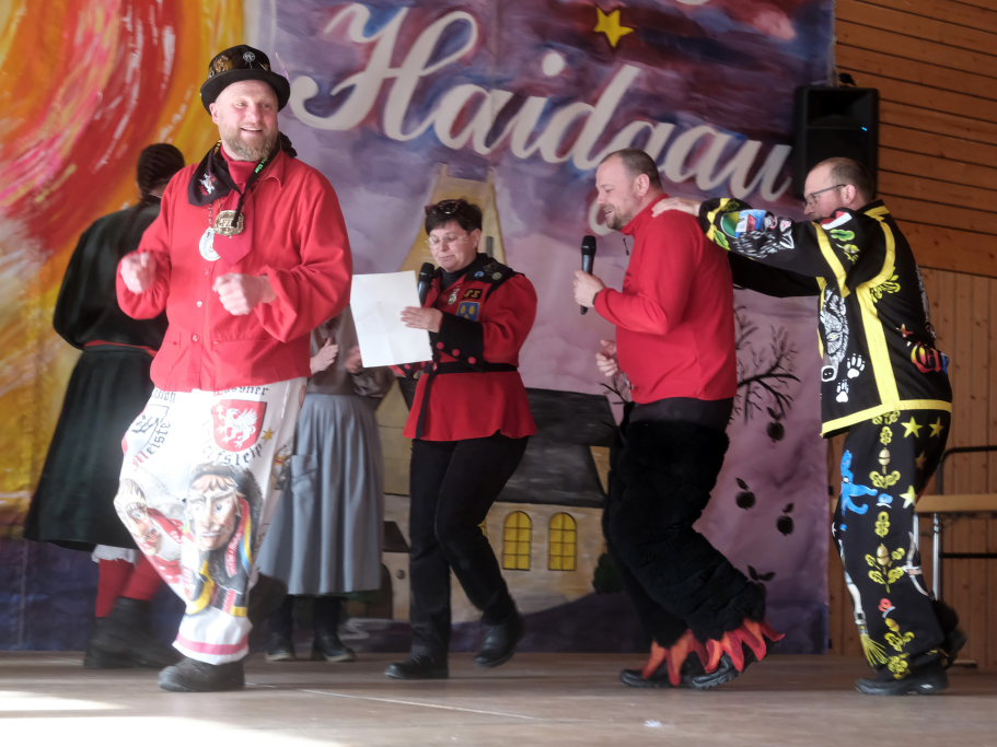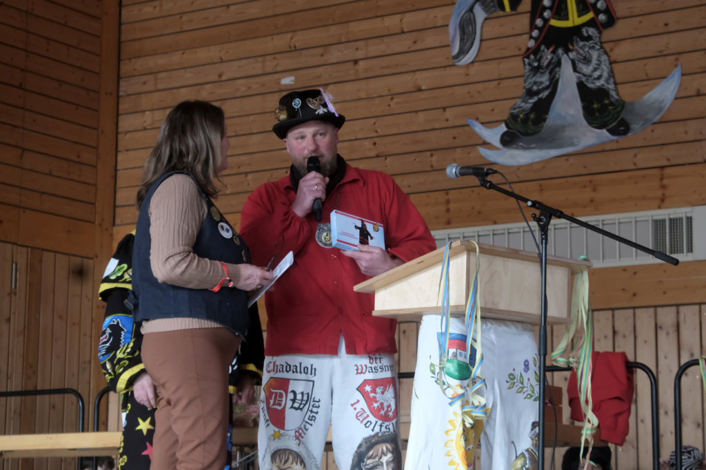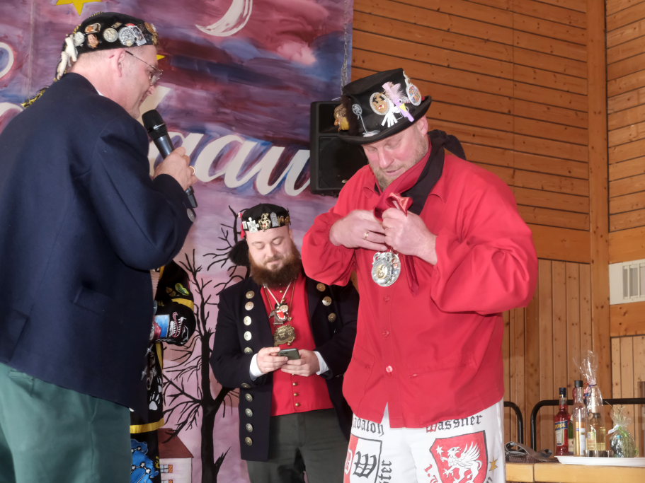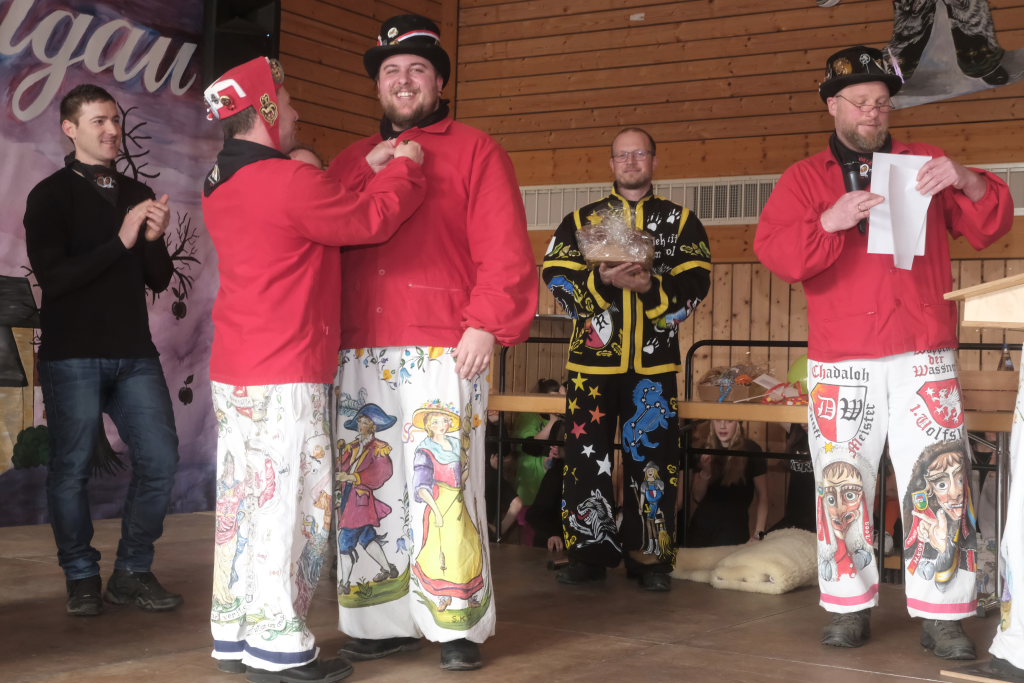 Danach betrat das vielköpfig vertretene ANR-Präsidium, allen voran Andreas Heine-Strahl, Bad Wurzachs neuer Stadtbaumeister, der als Brauchtumer des ANR in Haidgau ein Heimspiel hatte, die Bühne. Auf dem großen Samtkissen mitgebracht hatte er drei Orden des ANR. Mit dem Hästräger-Orden ausgezeichnet wurden Lennart Kohler und Tobias Hildebrand. Den Ehrenhäs-Orden mit Silberkranz an sein Häs angeheftet bekam Tobias Maucher, eine ganz besondere Ehrung mit der die Haidgauer Narren und der ANR dessen besonderen Leistungen für die Fasnet würdigten.