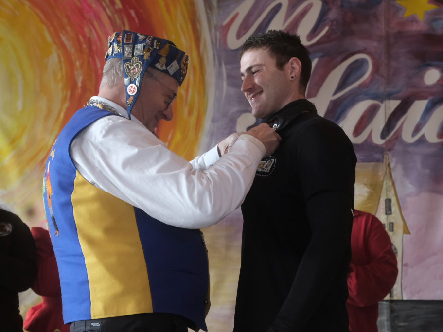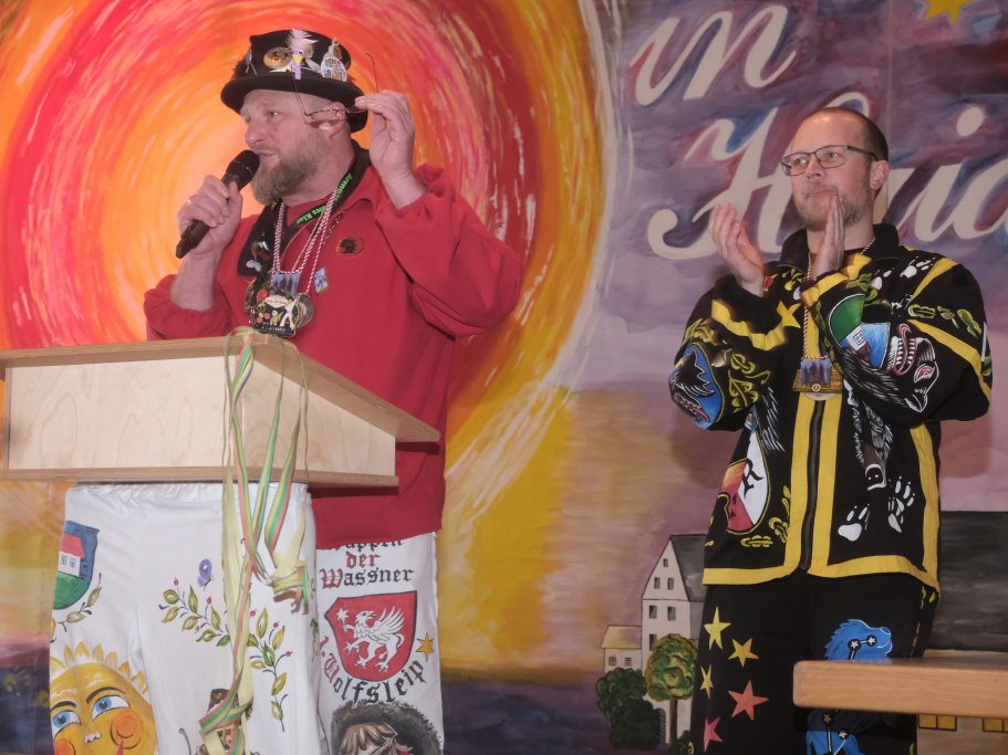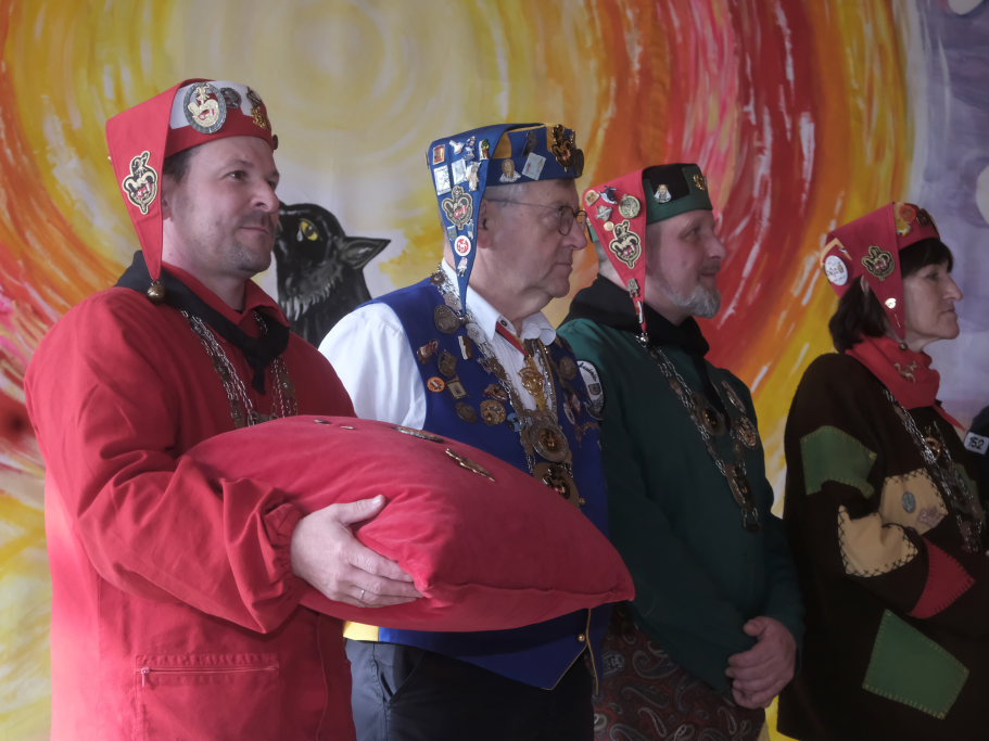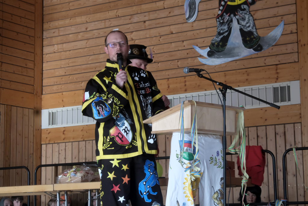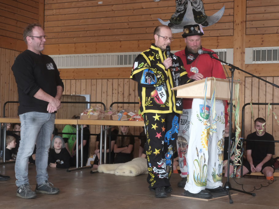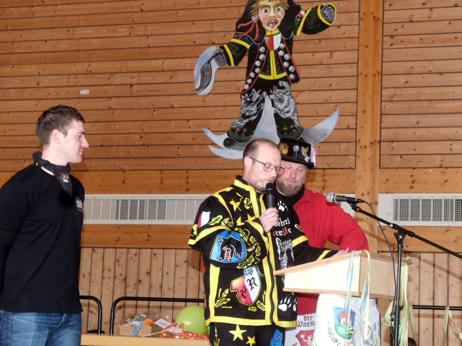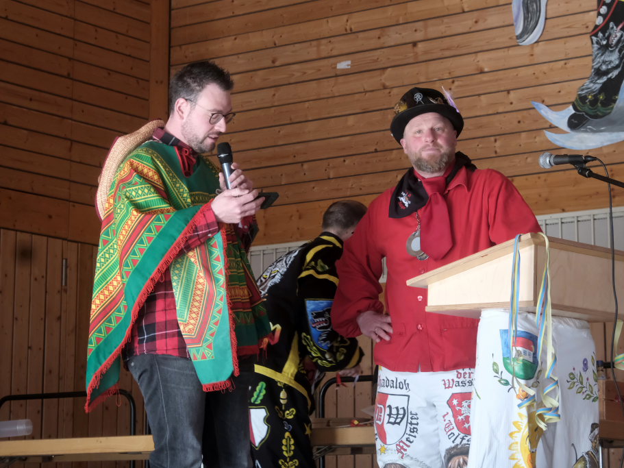 Danach betrat das vielköpfig vertretene ANR-Präsidium, allen voran Andreas Heine-Strahl, Bad Wurzachs neuer Stadtbaumeister, der als Brauchtumer des ANR in Haidgau ein Heimspiel hatte, die Bühne. Auf dem großen Samtkissen mitgebracht hatte er drei Orden des ANR. Mit dem Hästräger-Orden ausgezeichnet wurden Lennart Kohler und Tobias Hildebrand. Den Ehrenhäs-Orden mit Silberkranz an sein Häs angeheftet bekam Tobias Maucher, eine ganz besondere Ehrung mit der die Haidgauer Narren und der ANR dessen besonderen Leistungen für die Fasnet würdigten.