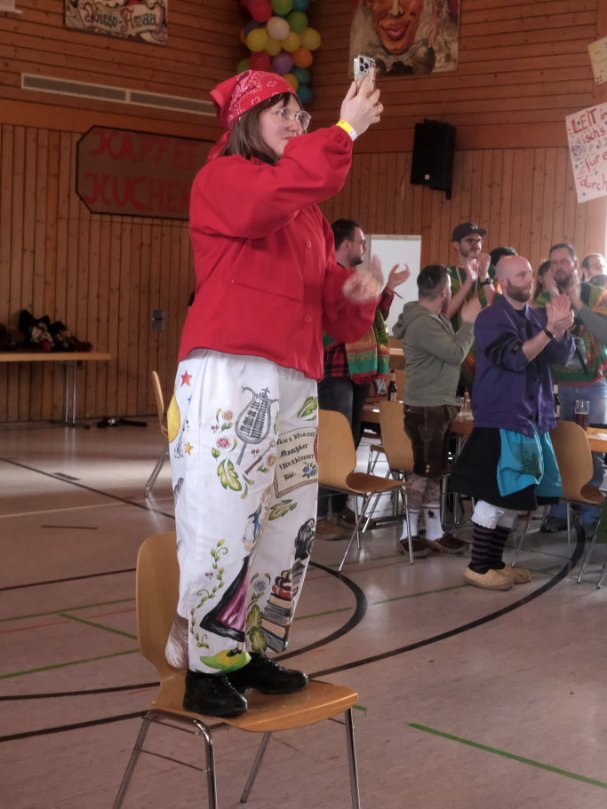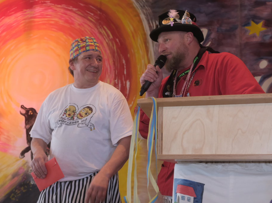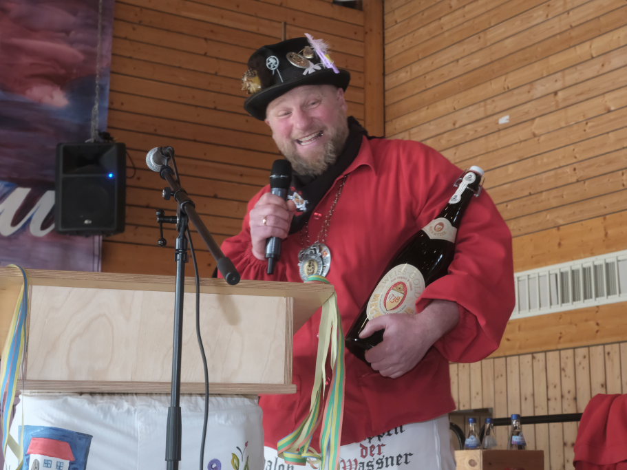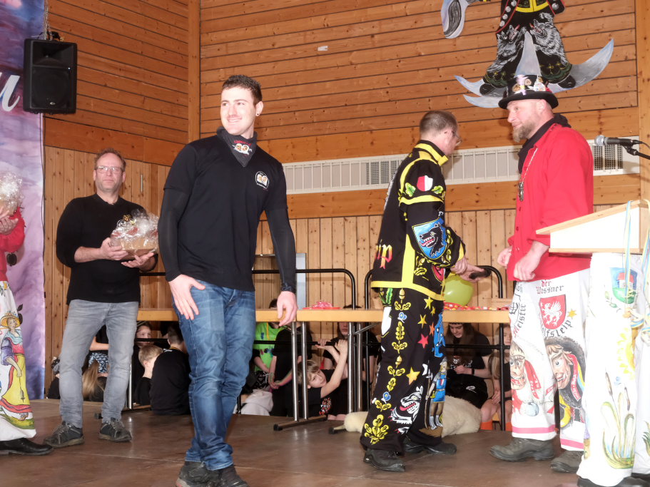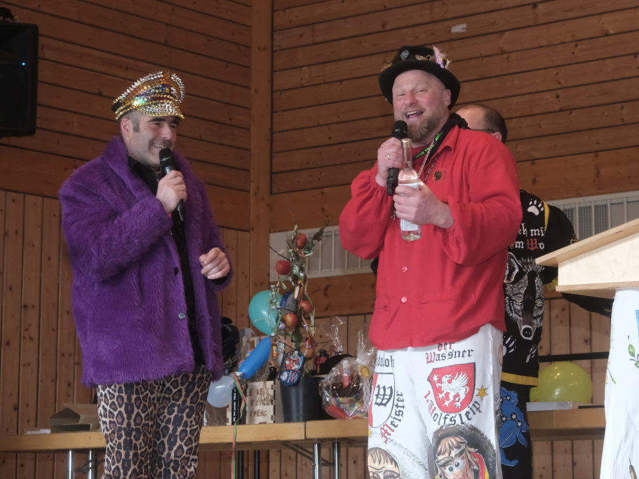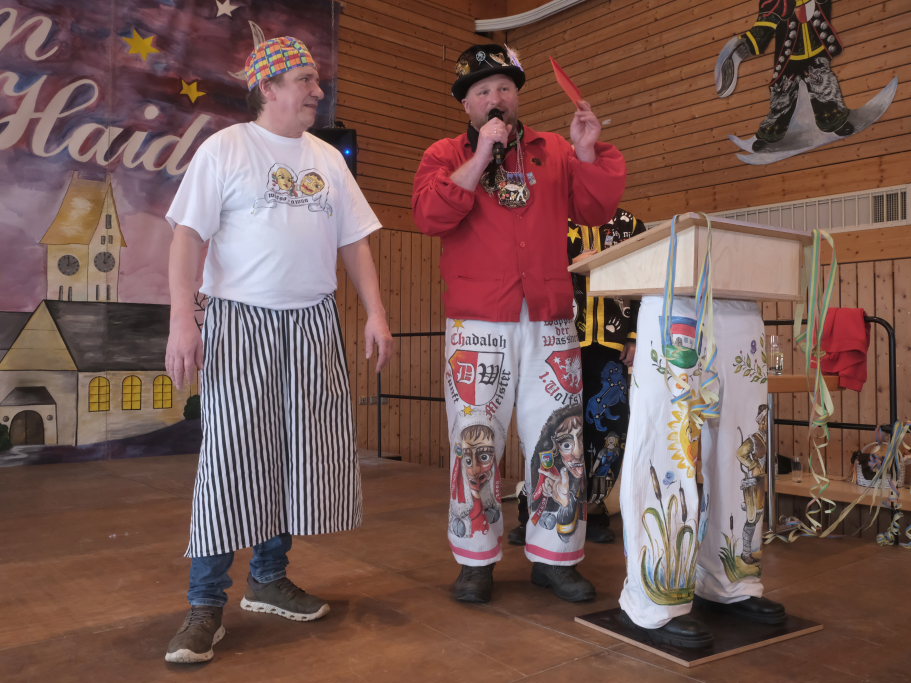 Die erste schwerere Prüfung erlegte „der Schwede“, Zunftmeister der Vogter Heufresser, dem Haidgauer Zunftmeister Daniel Wassner auf. Der dienstlich nicht an Dresscode-gemäßes Outfit gewohnte Zunftmeister (außer in der Fasnet!) sollte innerhalb weniger Minuten gleich mehrere Krawatten binden. Dabei konnte er natürlich sehr zum Gaudium des Publikums nur scheitern, zumal sich schon die erste – in Rot – die sich farblich mit der roten Weste der Haidgauer biss und am Hals von Wassner eher einer Schlinge, die sich nach und nach zuzieht, glich.