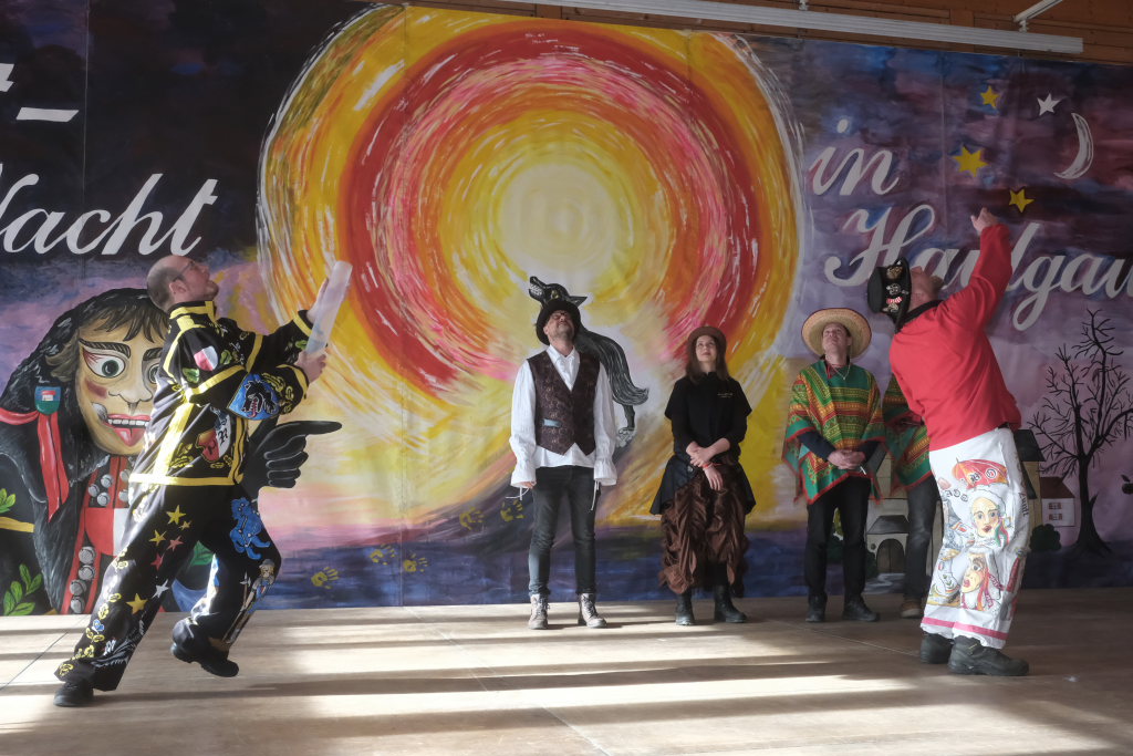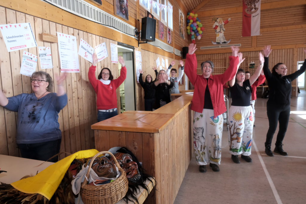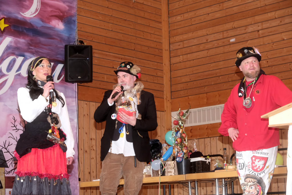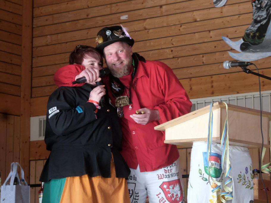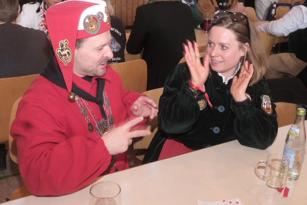Die Alttanner Höllteufel brachten dieses Team zum Tanzen, die Zunftmeisterin Christine Adamski der Bergatreuter Narrenzunft Berengar pflegte ihre innigen Kabbeleien mit Daniel Wassner. Der Zunftmeister der Dornstadter Dora-Weibla, Andrej Niederreiter, hatte wie immer ein Gedicht als Gastgeschenk dabei. Auch bei dieser Zunft fungierten die Haidgauer als „Gette“. Die Vertreterinnen der Hoigamer Stroaßa Hup´r entschuldigten sich noch einmal für ihren Ausfall für den Zunftmeisterempfang.