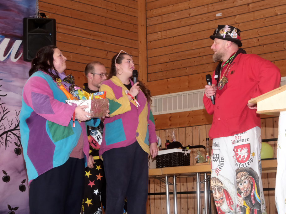 Dann war wieder der große Auftritt von Turbo Angele. Ein wenig hatte den gelernten Gärtner der Auftritt von Wasi beim Zunftmeisterempfang vor dem Ellwanger Narrensprung an seiner Berufsehre gepackt: Dort hatte Wasi nämlich – wie Angele sich jetzt ausdrückte – „als kotzkähler Allgäuer“ – einen Apfel abgebissen und mit dem Kommentar: „Der wird scho awachsa“ weggeworfen. Im Gegenzug erhielt Wasi als Gastgeschenk einen liebevoll einbetonierten künstlichen Apfelbaum, an dem die Äpfel mit Drähten befestigt waren. Ein besonderes, persönlich an die Adresse der Ehrenzunftmeisterin Doris Bendel gerichtetes Geschenk dabei hatten die Bockstall Narren aus Weingarten, weil Bendel mit ihrem Mann Ernst maßgeblich an der Entwicklung von deren neuester Fasnetsfigur beteiligt war.
