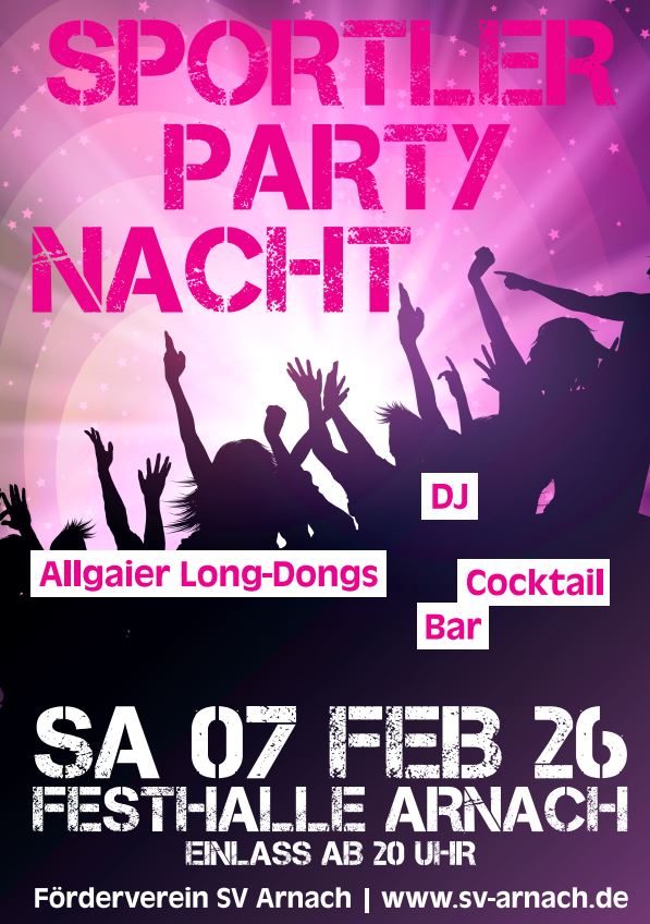 Arnach – Der Sportverein Arnach lädt am Samstag, 7. Februar, zur traditionellen Sportler-Partynacht in die Turn- und Festhalle Arnach ein.