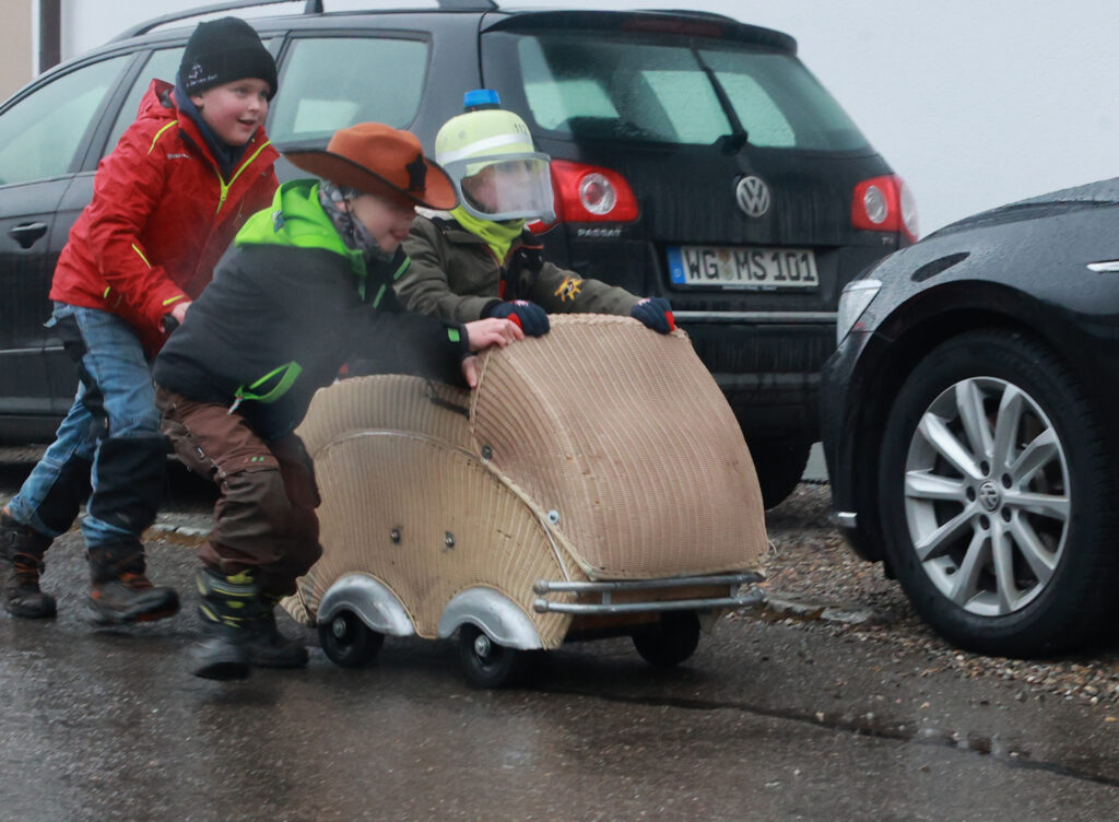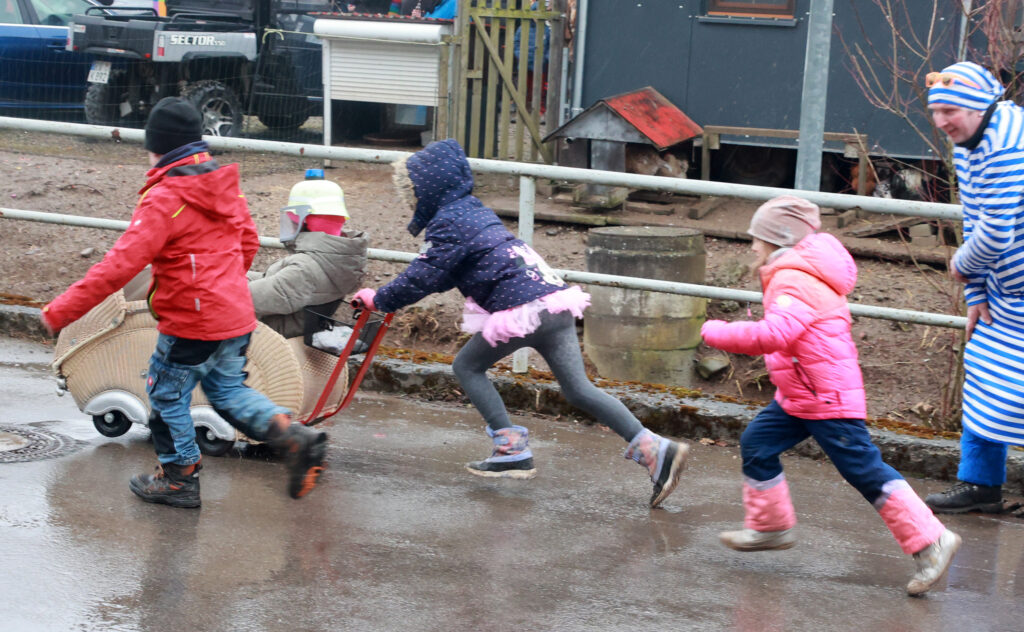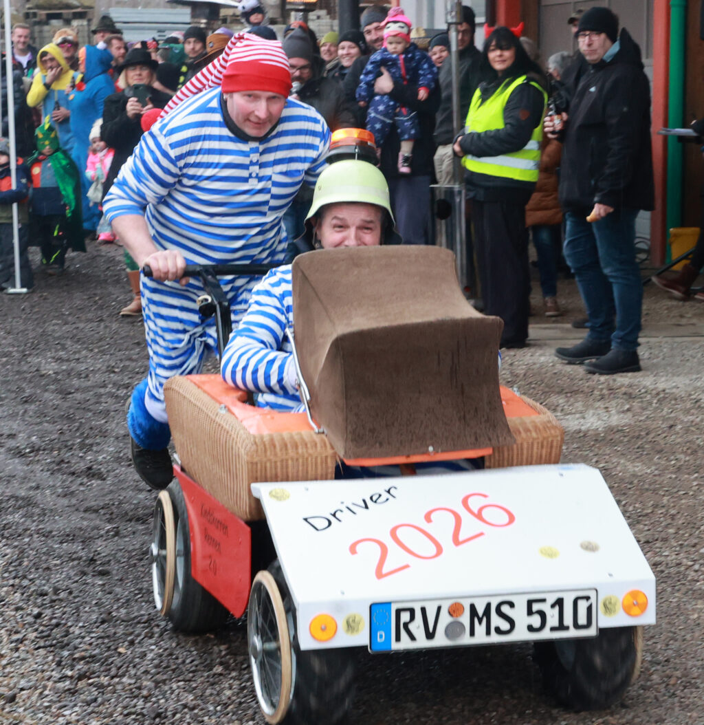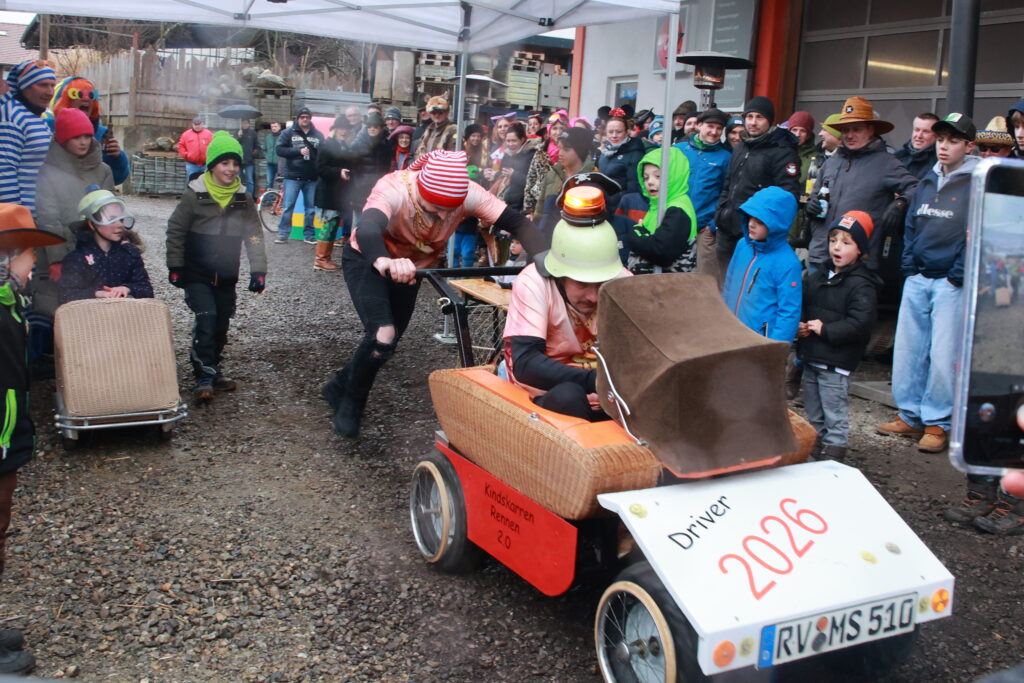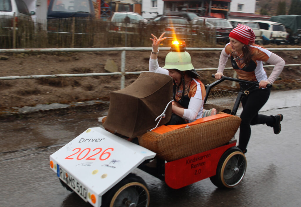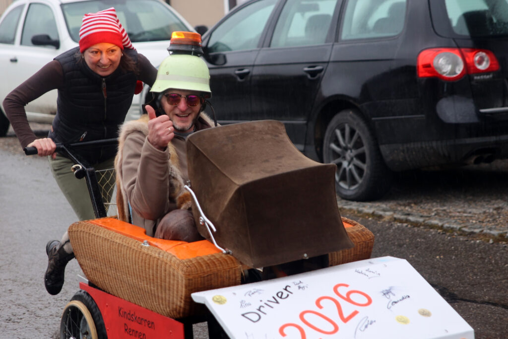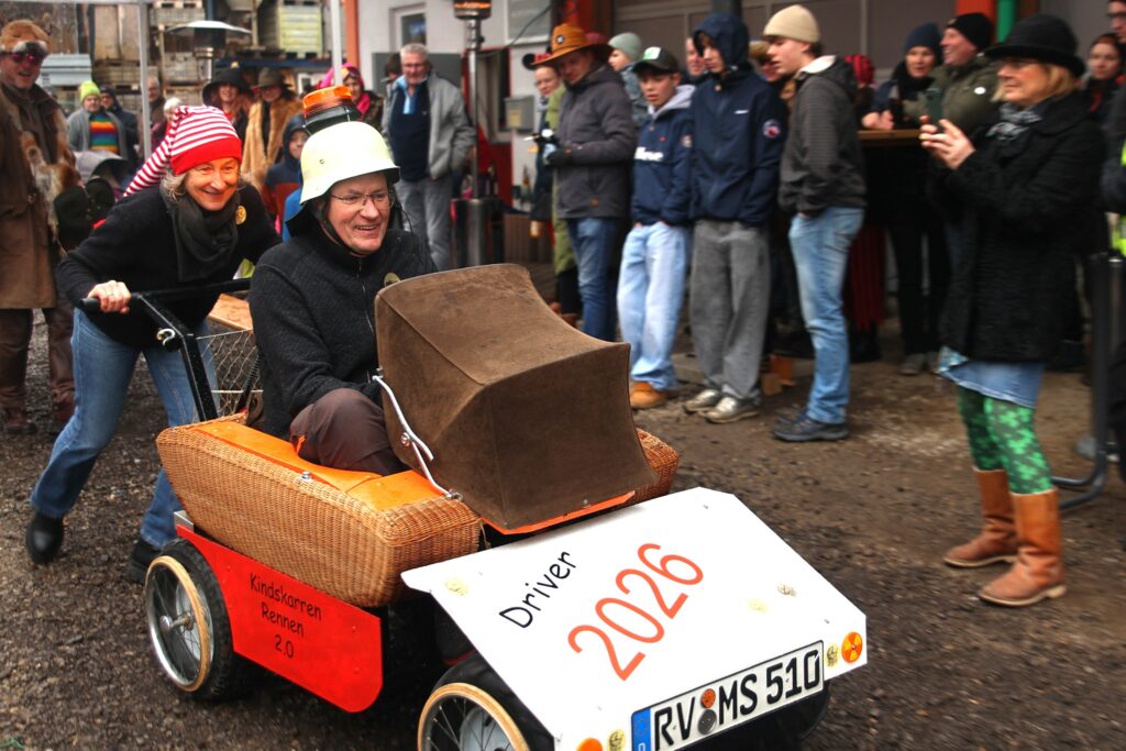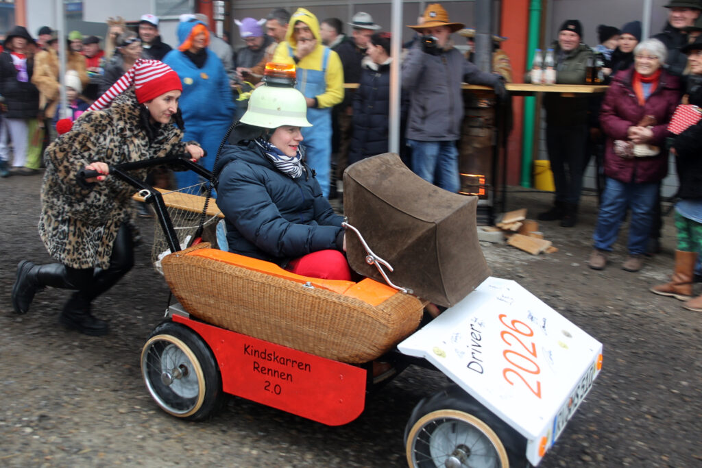 Hauerz – Normalerweise plätschert der Hauerzer Dorfbach gemächlich durch die Bachstraße. Doch an diesem Wochenende (14.2.) war Schluss mit Ruhe. Die Hauerzer Dorfgemeinschaft machte die Straße zur Rennstrecke. Beim traditionellen „Kindskarrenrennen“ rollten bunt geschmückte Kinderwägen über den Asphalt. Es waren vier Kinderteams am Start und 16 Teams von Erwachsenen. Jung und Alt feuerten begeistert an.