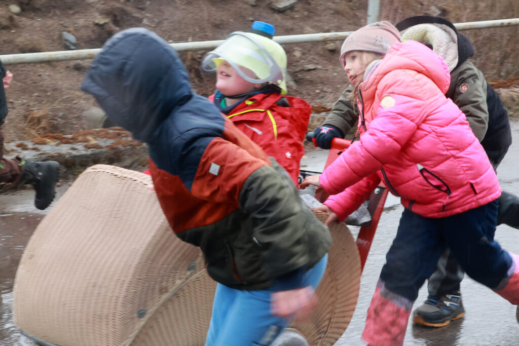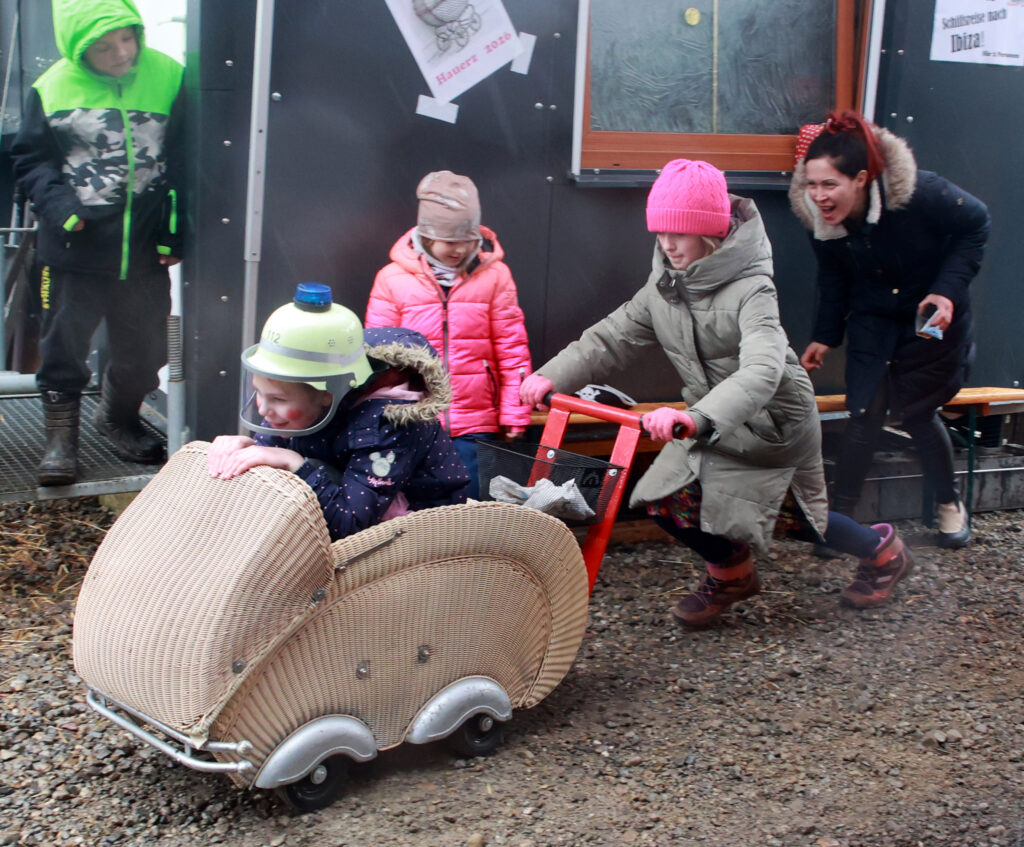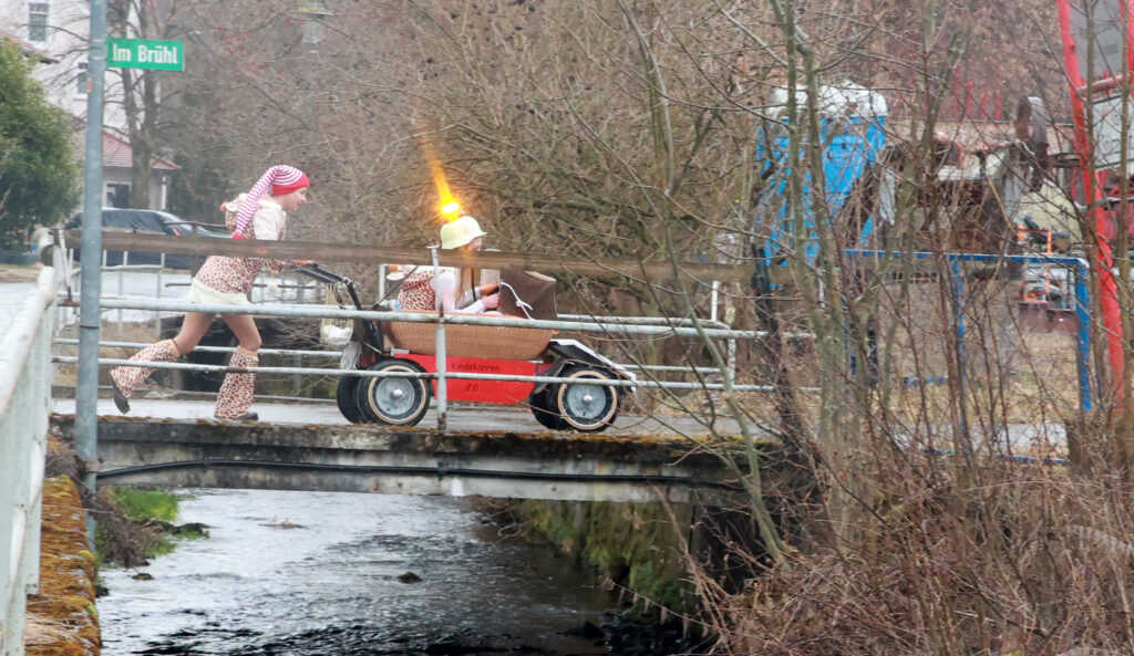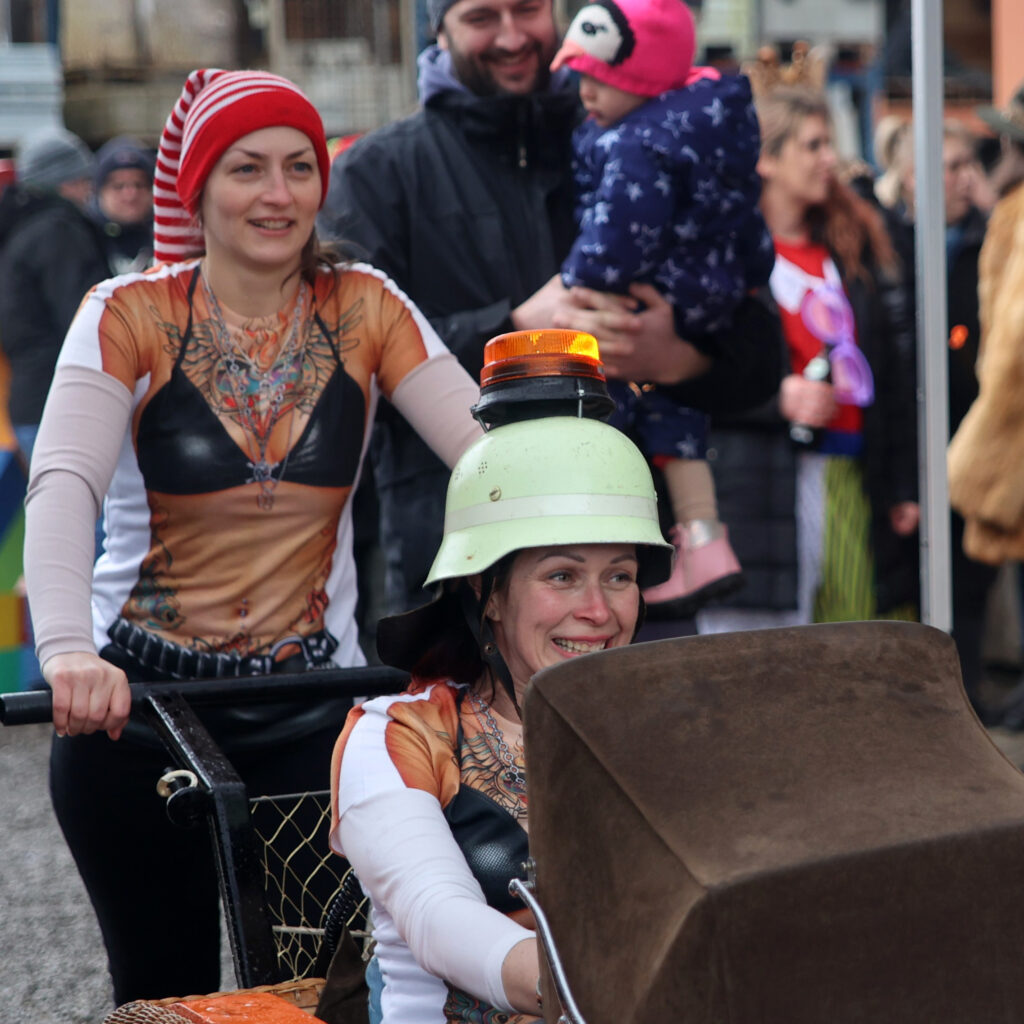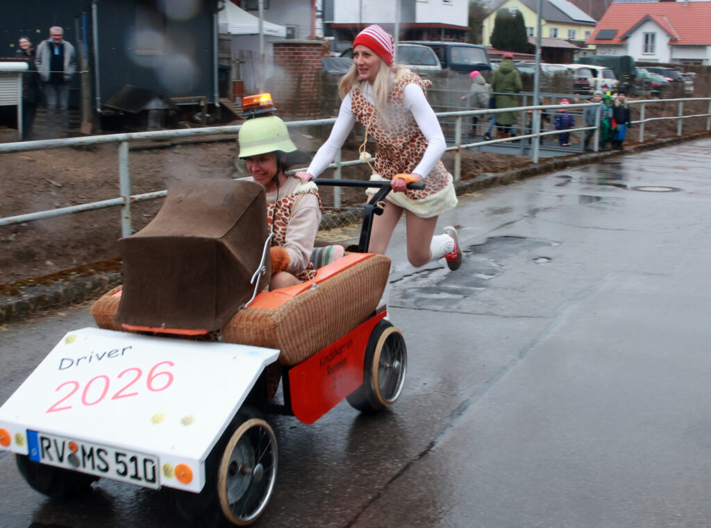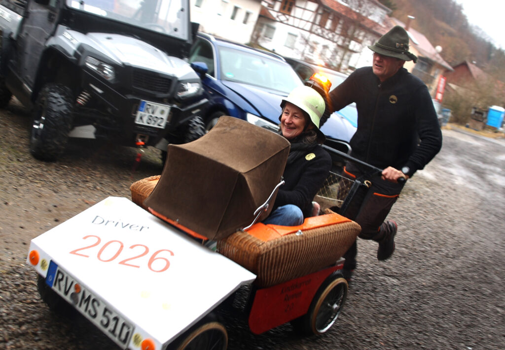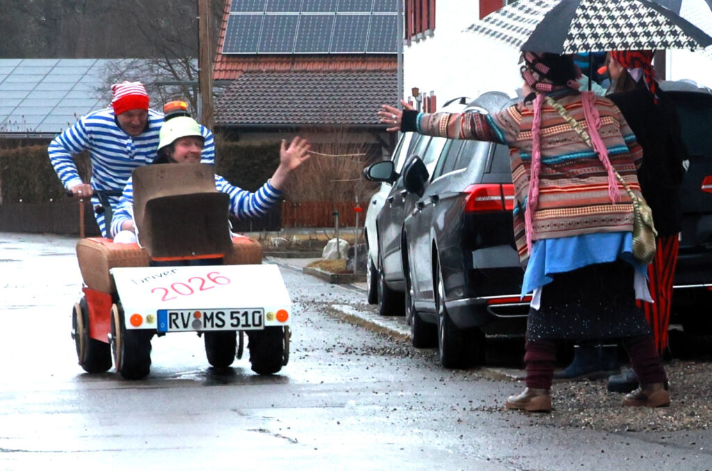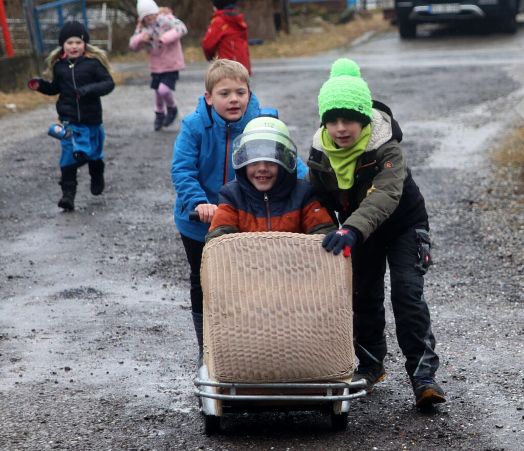 Hauerz – Normalerweise plätschert der Hauerzer Dorfbach gemächlich durch die Bachstraße. Doch an diesem Wochenende (14.2.) war Schluss mit Ruhe. Die Hauerzer Dorfgemeinschaft machte die Straße zur Rennstrecke. Beim traditionellen „Kindskarrenrennen“ rollten bunt geschmückte Kinderwägen über den Asphalt. Es waren vier Kinderteams am Start und 16 Teams von Erwachsenen. Jung und Alt feuerten begeistert an.
