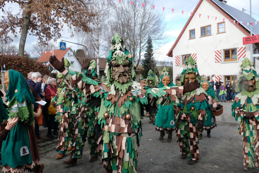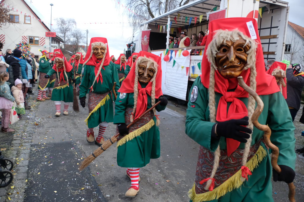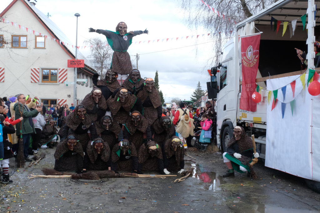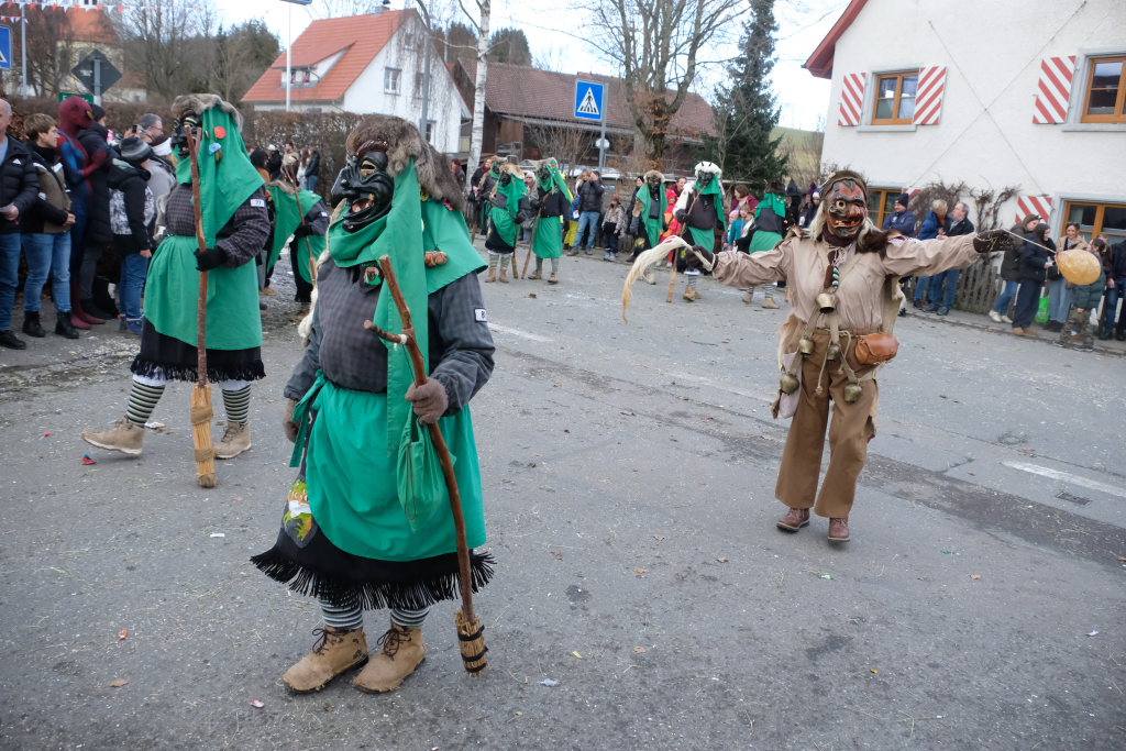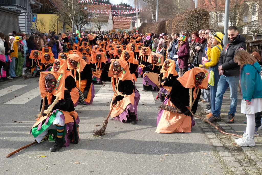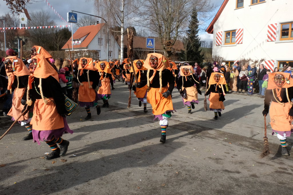 Mit den Unterschwarzachern Schwaaz´r Butz folgte eine weitere Zunft, bei denen die Chadalohs als Pate für die ANR-Aufnahme fungiert hatten. Alljährlich nicht fehlen durfte da natürlich nicht die Garde der LJG Unterschwarzach. Mit den reizenden Damen konnte auch Alex Wild wieder seine tänzerischen Fähigkeiten sowie seine Gelenkigkeit unter Beweis stellen. Ganz Bergatreute dürfte wieder einmal wie leergefegt gewesen sein, denn ein orange-grünes Jordanhexen-Meer flutete die Straßen des kleinen Ortes am nördlichen Riedrand. Auch die Baienfurter Henkerhaus Zunft und die Dora-Weibla aus Dornstadt sind Patenzünfte der Chadalohs. Natürlich nicht fehlen durfte die Haidgauer „Konkurrenz“, die Haidgauer (… )Sippe, die in der Vergangenheit im Zuge des Gender-Wahns einen Teil ihres Namens eingebüßt hat und der Vertreter beim Zunftmeisterempfang mit dem Singen des Volksliedes „Lustig ist das (Beep)-Leben“ ein kleines Statement abgaben.