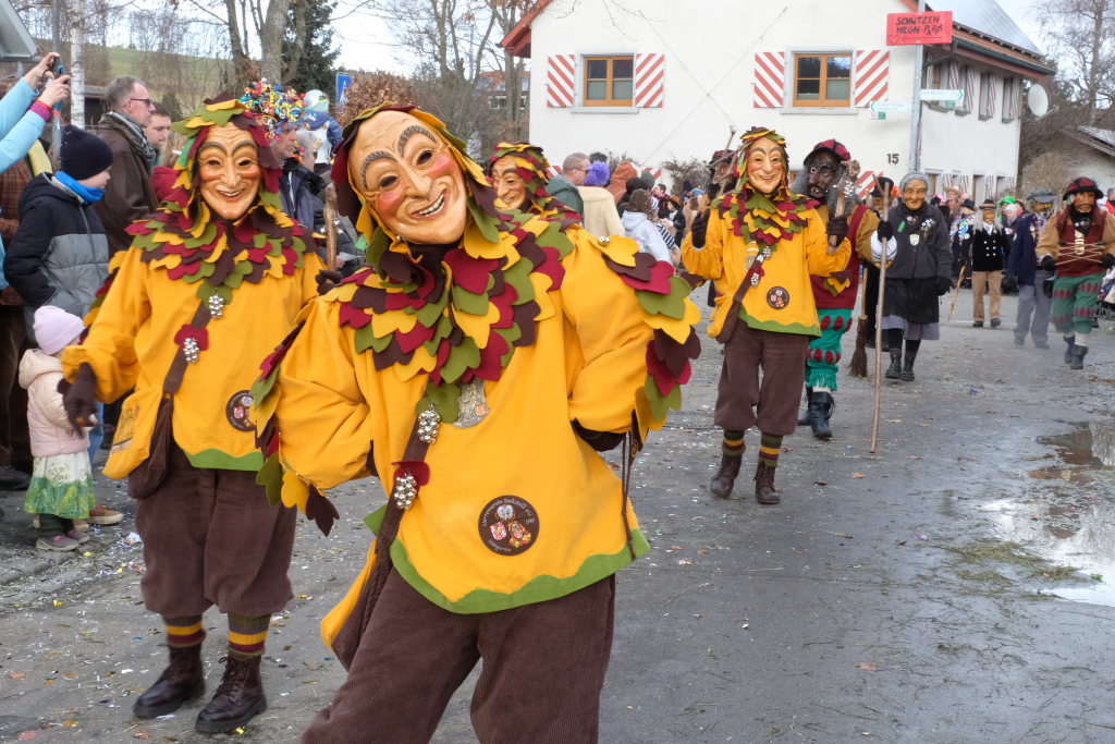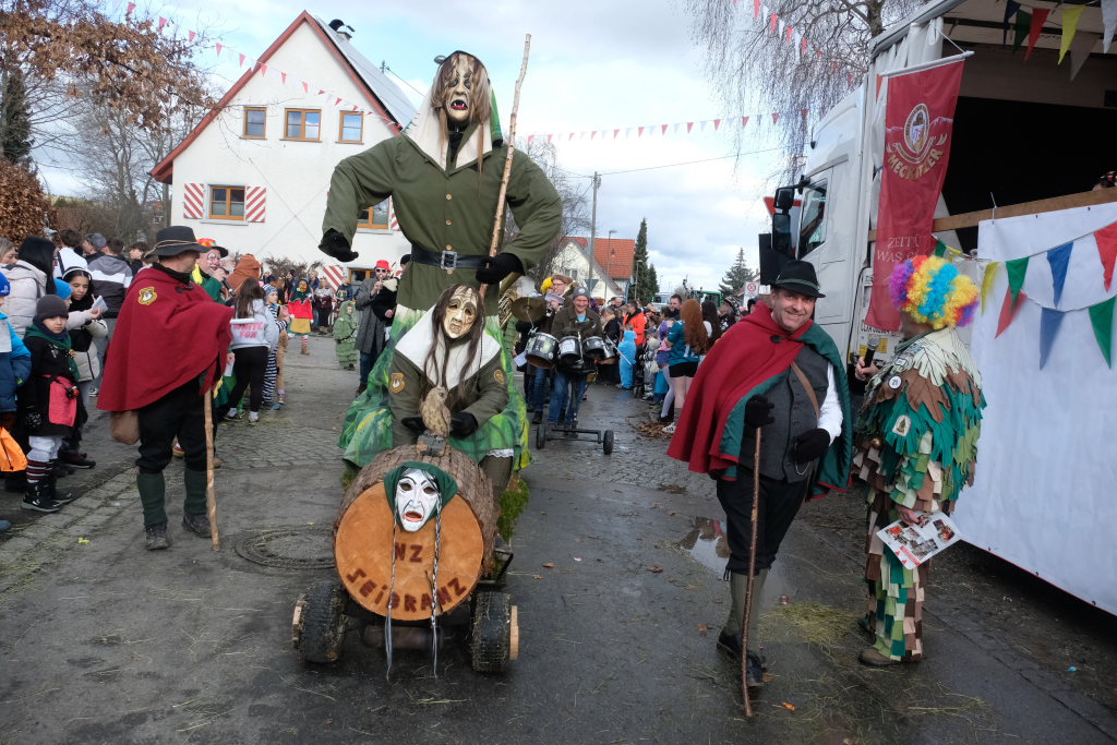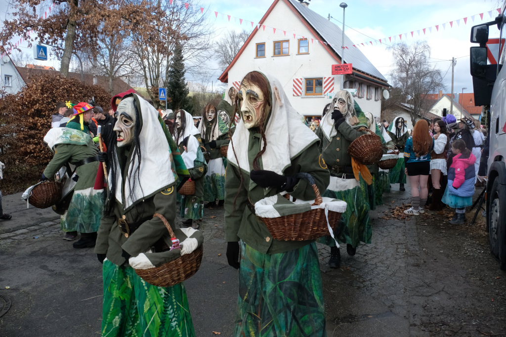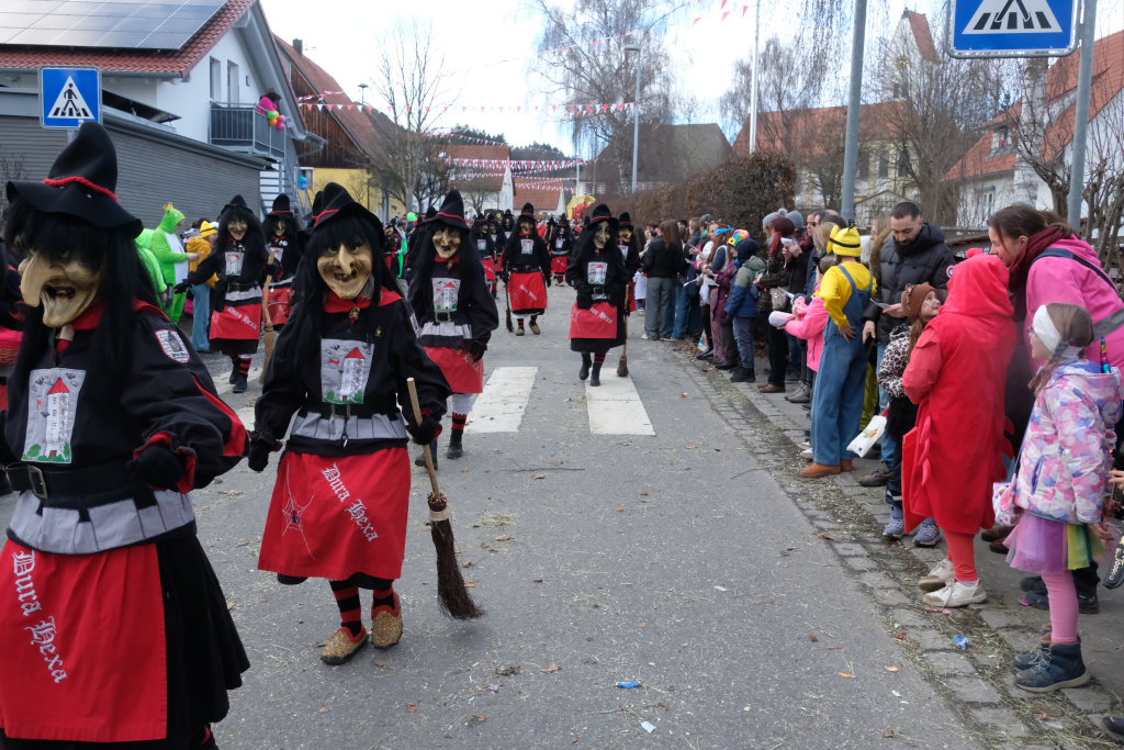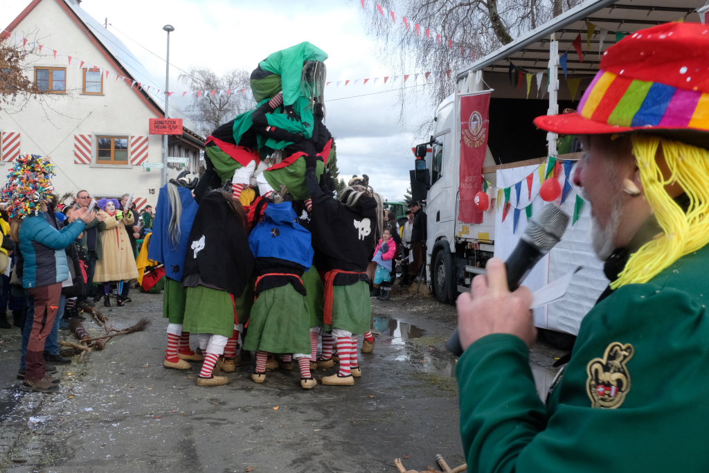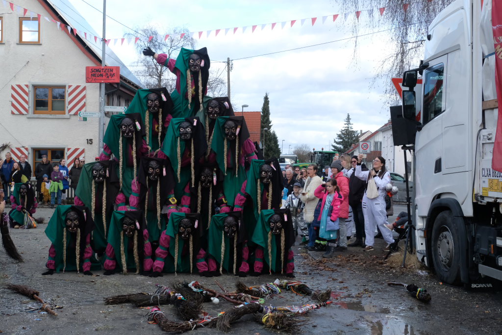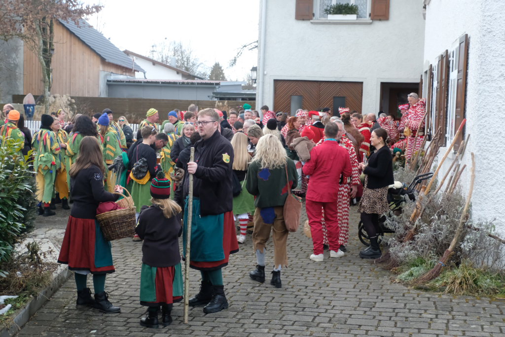 Mit den Unterschwarzachern Schwaaz´r Butz folgte eine weitere Zunft, bei denen die Chadalohs als Pate für die ANR-Aufnahme fungiert hatten. Alljährlich nicht fehlen durfte da natürlich nicht die Garde der LJG Unterschwarzach. Mit den reizenden Damen konnte auch Alex Wild wieder seine tänzerischen Fähigkeiten sowie seine Gelenkigkeit unter Beweis stellen. Ganz Bergatreute dürfte wieder einmal wie leergefegt gewesen sein, denn ein orange-grünes Jordanhexen-Meer flutete die Straßen des kleinen Ortes am nördlichen Riedrand. Auch die Baienfurter Henkerhaus Zunft und die Dora-Weibla aus Dornstadt sind Patenzünfte der Chadalohs. Natürlich nicht fehlen durfte die Haidgauer „Konkurrenz“, die Haidgauer (… )Sippe, die in der Vergangenheit im Zuge des Gender-Wahns einen Teil ihres Namens eingebüßt hat und der Vertreter beim Zunftmeisterempfang mit dem Singen des Volksliedes „Lustig ist das (Beep)-Leben“ ein kleines Statement abgaben.